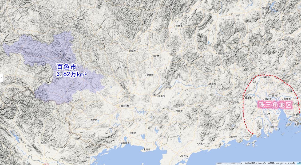“胡焕庸线”以西的内陆地区,东北黑龙江省北部的寒冷地区,自然环境不太友好,地广人稀,行政区特别大不奇怪。靠近东部发达省份的超大地市级行政区还是很特别的,地图上看着都惊人。广东省西边和北边的省份都有这种情况,一个是江西省的赣州市,面积大约3.95万平方公里;另一个是广西的百色市,面积大约3.62万平方公里。 这两个地级市,面积都超过了台湾省,也超过去除边缘山区的珠三角。尤其是赣州市,下面有3区、2县级市、13县,合计多达18个县级行政区,常住人口接近900万,真的是超级庞大。 大家如果从广东珠三角出发,开车去江西、安徽、山东这个方向,肯定对赣州之大印象深刻;同样,如果开车去云南,路过百色,也一定会惊讶几个小时都出不了。