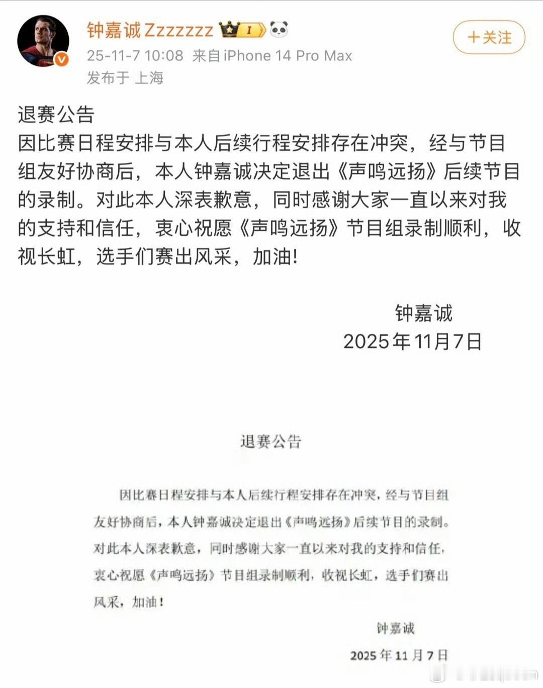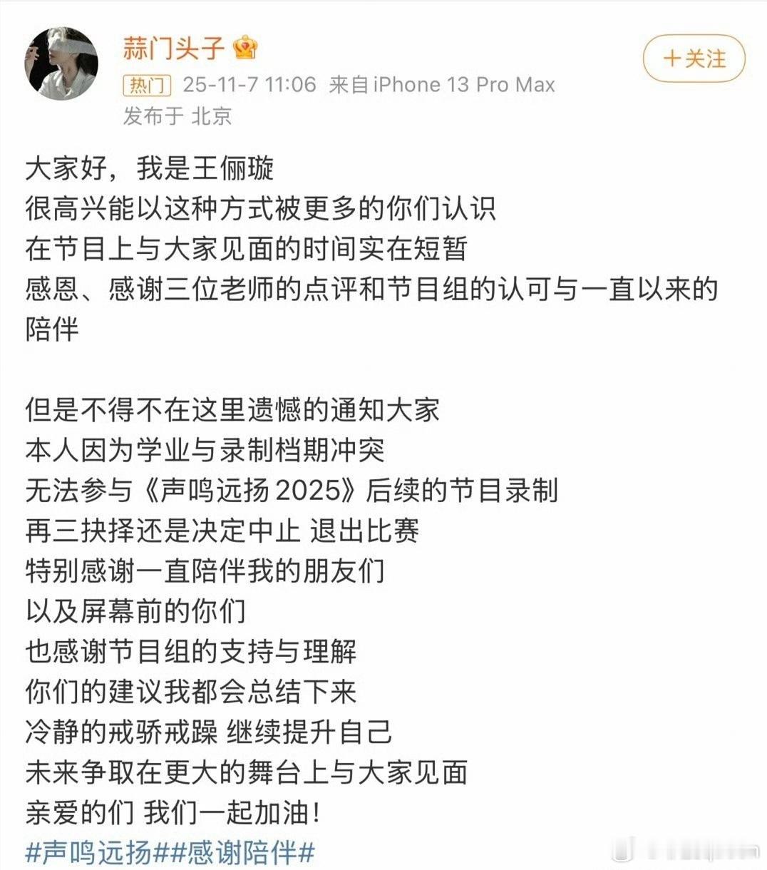 声鸣远扬36强有三位退赛声鸣远扬 虽因遗憾暂别舞台,但这段旅程的热爱与成长从未褪色。感谢每段真诚演唱,愿三位带着收获奔赴新程,未来在更广阔的天地继续闪闪发光! ​​​