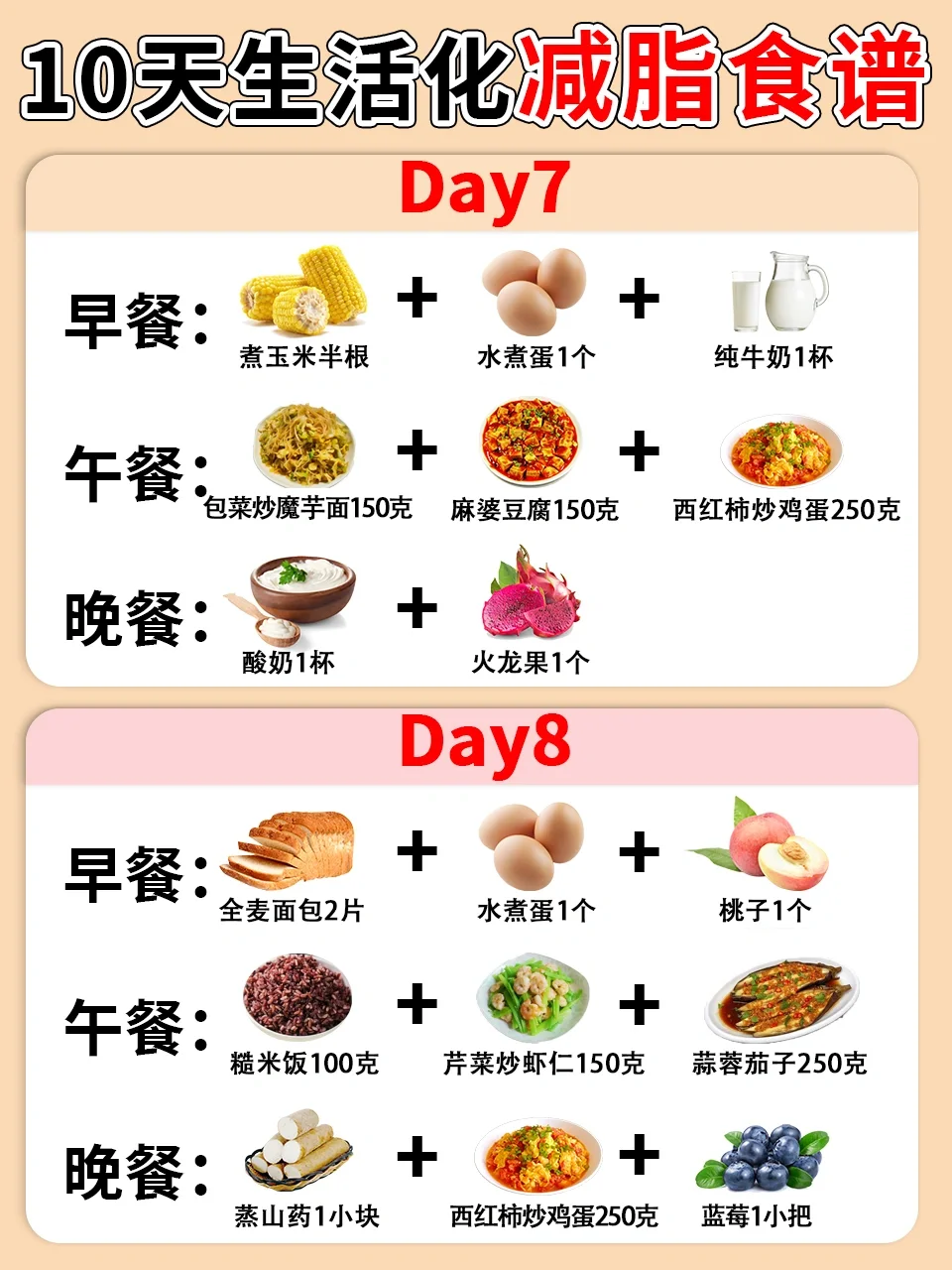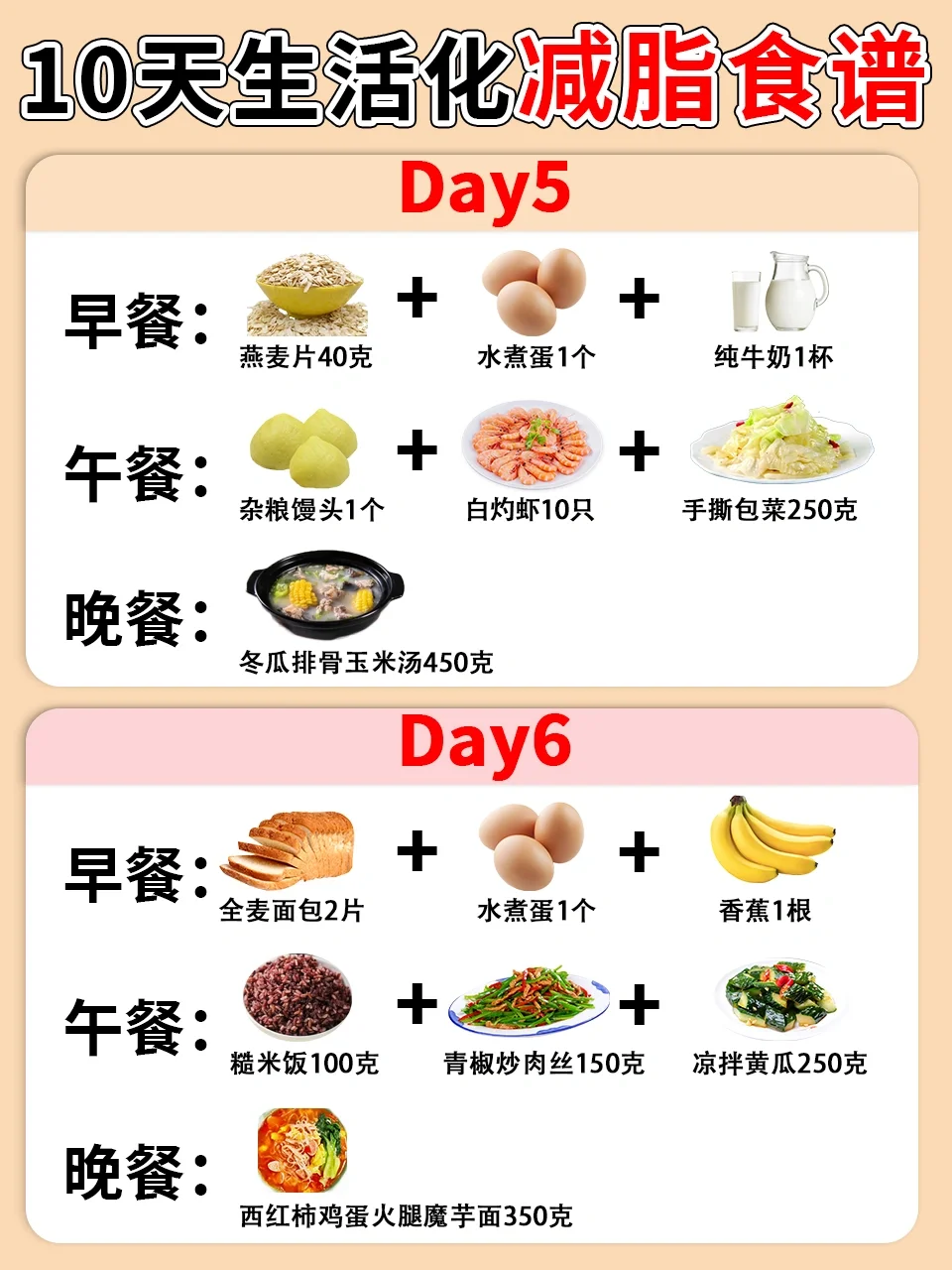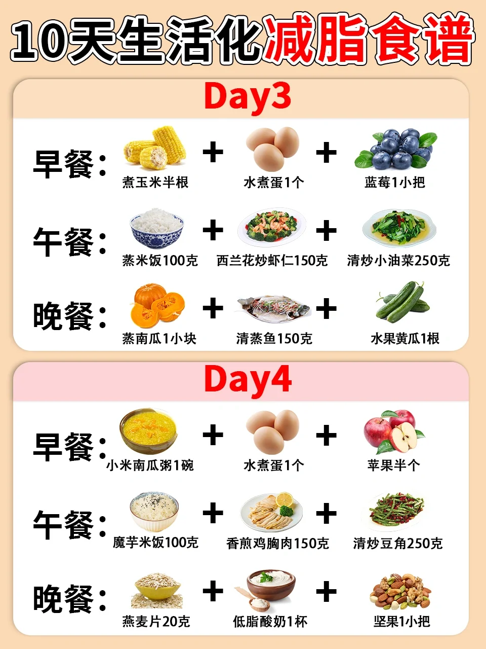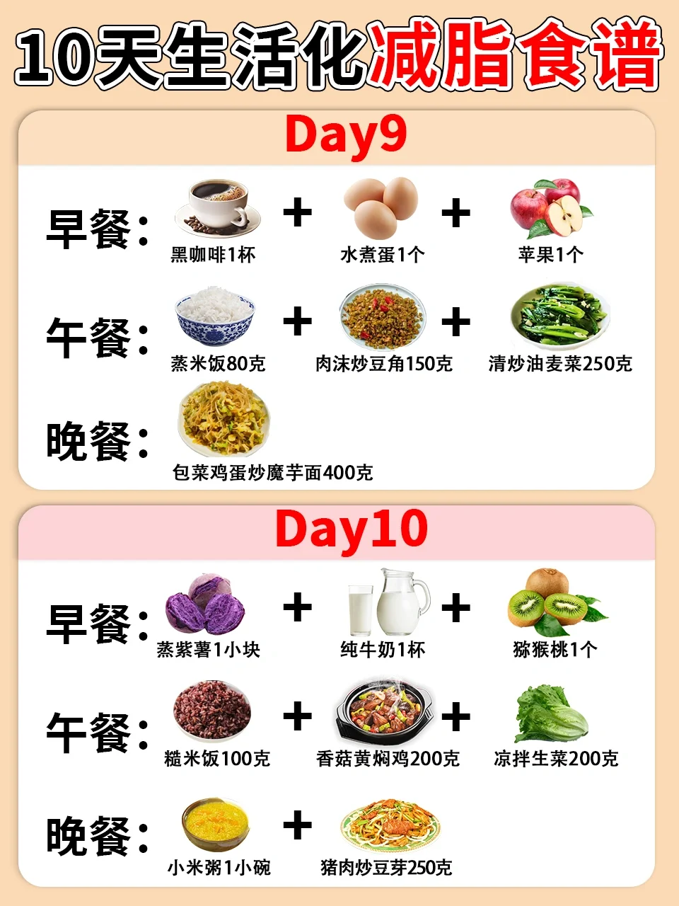 别担心,今天小毒为大家整理了一份10天生活化减脂食谱,食谱容易坚持并且食材都非常常见哦,减脂期的宝子学起来吧❤️