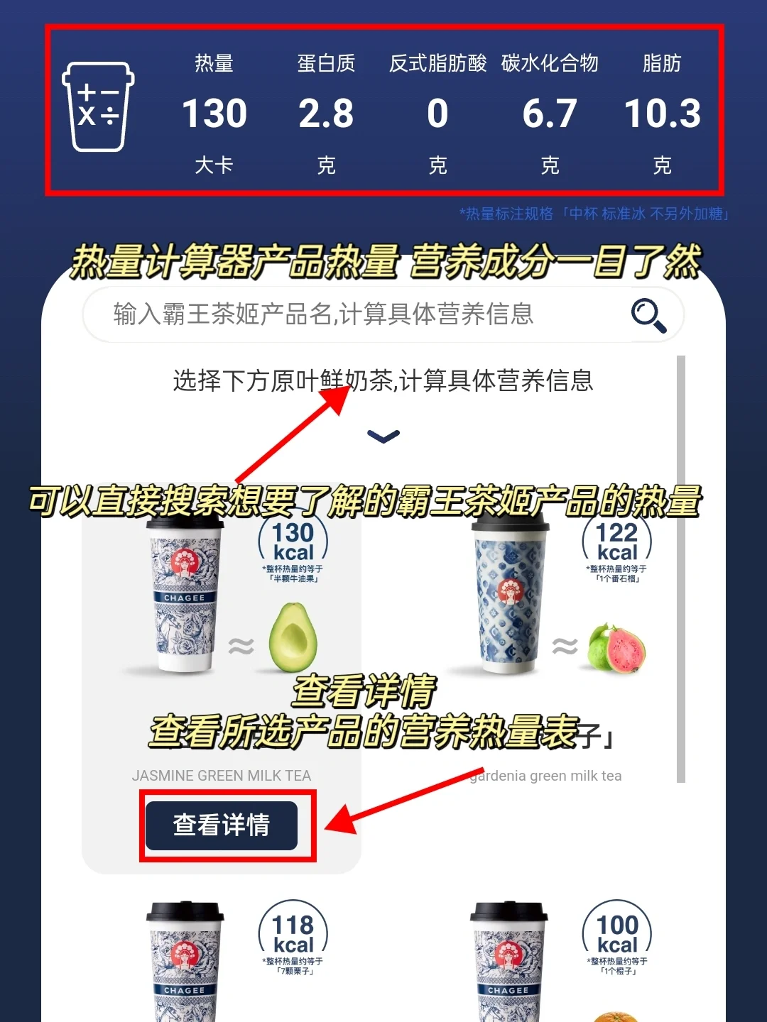 热量计算器中霸王茶姬全线产品的热量一目了然♥️减脂人士也可以根据自己的热量摄入情况定制专属自己的茶饮[萌萌哒R]霸王茶姬真的真的很用心,不仅口感好还更专业更真诚,为减肥人士打造出适合的茶饮,并且还是跟Keep联名的哦,以后茶姬想喝就喝,只要热量计算器上一查热量一目了然‼️‼️