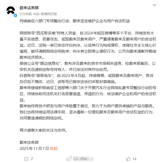 蔚来将继续积极响应工信部等六部门关于开展汽车行业网络乱象专项整治行动的号召,持续协助司法机关打击恶意造谣、传谣的行为,依法维护企业和用户的合法权益。