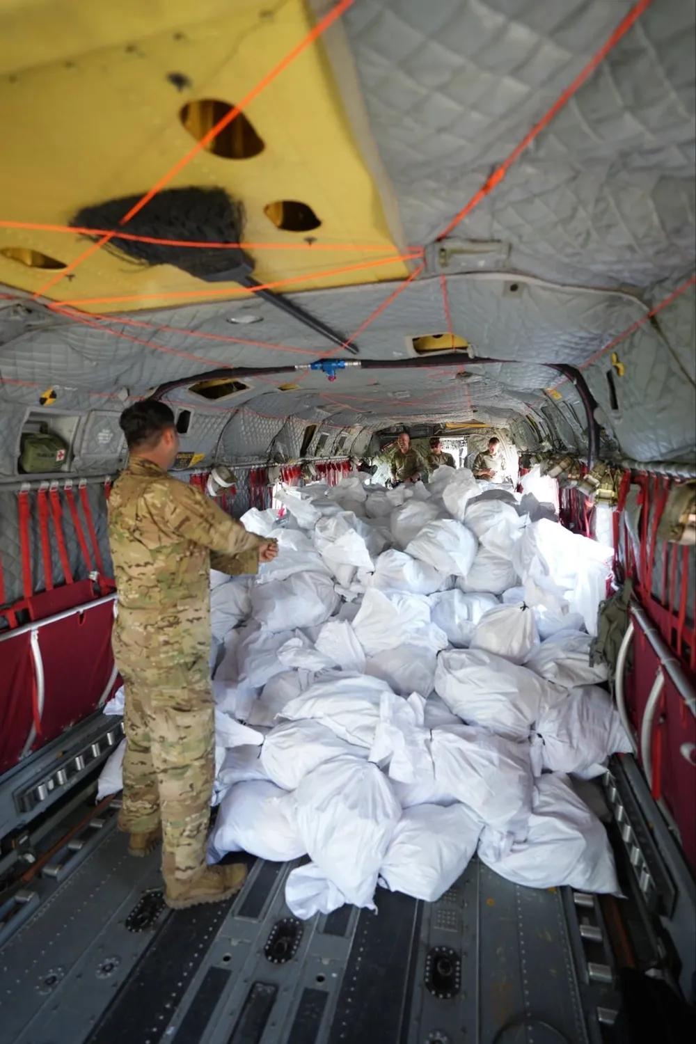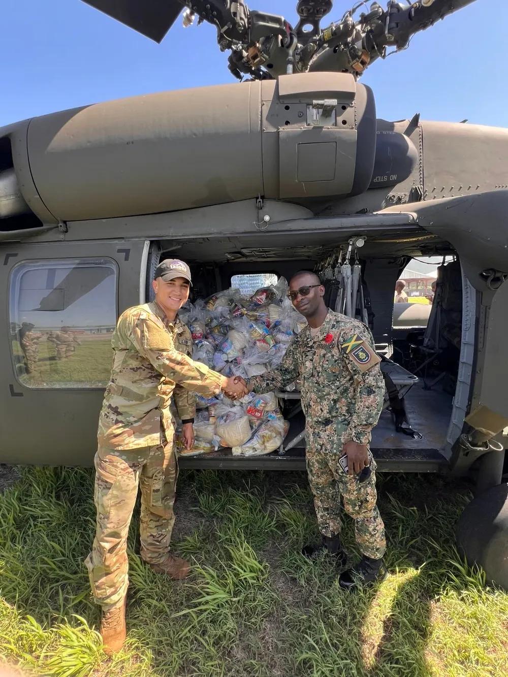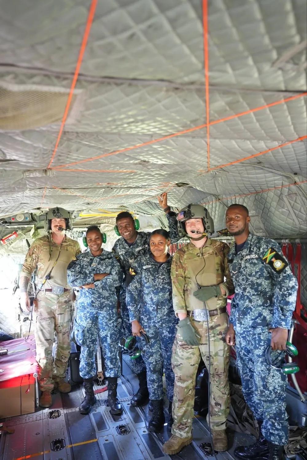 一场飓风给美军提供扩大在加勒比国家牙买加影响力的机会。 2025年11月4日,牙买加金斯敦,来自美军第228航空团第1营、联合特遣部队布拉沃的美军士兵,与牙买加国防军士兵在分配给第1-228航空团的CH-47支奴干直升机旁联合救灾行动。美军部队根据美国南方司令部的指示部署到牙买加,以在美丽莎飓风过后提供即时的救生援助。