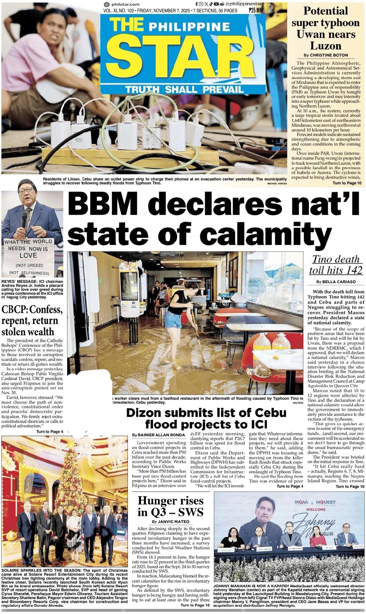 《菲律宾星报》头版报道称,对于袭击菲律宾中部的25号台风,当局6日宣布,死亡人数已达到至少114人。 失踪人数已升至120多人,遇难人数可能进一步增加。虽然台风已经过去,但未来几天有新的台风登陆的风险,因此马科斯总统当天宣布为“国家灾难”。 台风过后宿务市据报道,拥有热门旅游胜地宿务岛的宿务省报告了最严重的损失,退水后,道路和房屋上堆积了大量碎片,居民们正在努力修复。 这名正在从家里铲泥的男子告诉记者,“我在那里住了将近16年,但这是我第一次这样做。 据信,这次的许多死亡者是在河流洪水造成的洪水中溺水身亡。 在菲律宾,今年,人们发现,尽管预算用于国家防洪工程,但仍有许多“幽灵项目”没有进展。 人们怀疑承包商正在向包括总统亲属和助手在内的大量政客返还资金,9月全国各地发生了大规模抗议活动。 在社交网站(SNS)上,“大自然暴露了一切”“这是偷工减料的结果,最终是人民受苦”等帖子接连发布,批评破坏和腐败指控的声音正在迅速传播。 另据报道,河堤出现了一条大裂缝,有声音质疑该项目的有效性。 宿务州长帕梅拉·巴里夸特罗也在社交媒体上指出,尽管投入了大量防洪资金,但还是造成了巨大的损失。据政府称,2022年至25年间,该州实施了267亿比索的防洪项目。州长表示,有报道称已经实施防洪措施的地区遭到严重破坏,并要求政府核实该州的防洪项目。 针对这些事态发展,据当地媒体报道,总统发言人在5日的新闻发布会上宣布,菲律宾总统小马科斯已下令调查宿务省防洪工程的有效性。他呼吁提供信息,包括前杜特尔特政府时期的建设工程。