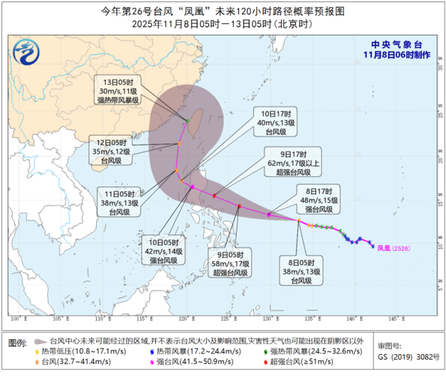 今年第26号台风“凤凰”已于昨天(7日)晚上由强热带风暴级加强为台风级,今天(8日)早晨5点钟其中心位于菲律宾马尼拉偏东方向大约1350公里的西北太平洋洋面上,中心附近最大风力有13级(38米/秒),中心最低气压为965百帕,七级风圈半径380~460公里,十级风圈半径180~200公里,十二级风圈半径80公里。预计,“凤凰”将以每小时30~35公里的速度向西偏北方向快速移动,强度快速增强,最强可达超强台风级(55~65米/秒,16级~17级以上),逐渐向菲律宾吕宋岛东部沿海靠近,穿过吕宋岛后强度减弱,将于10日中午到夜间移入南海,之后逐渐转向偏北方向移动(见图2)。