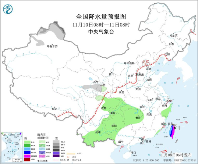 11月9日08时至10日08时,内蒙古东北部、黑龙江北部和东部、青海东部等地部分地区有小雪或雨夹雪。江淮西部、江汉南部、江南大部、西南地区东部和南部、广西西部、海南岛、台湾岛等地部分地区有小到中雨,其中,云南西南部局部有大雨。内蒙古东部、华北北部、东北地区南部等地部分地区有4~6级风;南海中东部海域将有9~10级、阵风11级增大到11~12级、阵风13级的偏北风,巴士海峡、南海东北部海域将有8~10级、阵风11级的偏东到东北风,台湾海峡将有7~9级、阵风10级的东北风(见图4)。