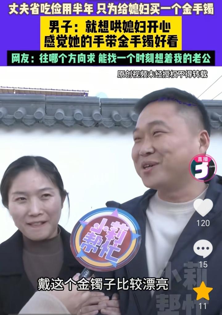 嘴上不说心里话!河南商丘,男子为了哄妻子开心,省吃俭用一年左右,然后给妻子买了一个金手镯,男子觉得妻子的手戴一个金镯子很好看,妻子面对采访满脸幸福的表示,钱都在自己手里自己买肯定舍不得,虽然嘴上说他乱花钱买金镯子,但是心里肯定是特别感动开心的。 都说女的嘴上不说心里话,这回是真信了,丈夫给买了金镯子,女子虽然嘴上埋怨丈夫,但是心里既感动又开心。 虽然丈夫没有那么多甜言蜜语海誓山盟,但是他用行动证明了对妻子的爱,这就是嫁对人的幸福感。 嫁人怎么可能嫁给谁都一样,大家认为呢?