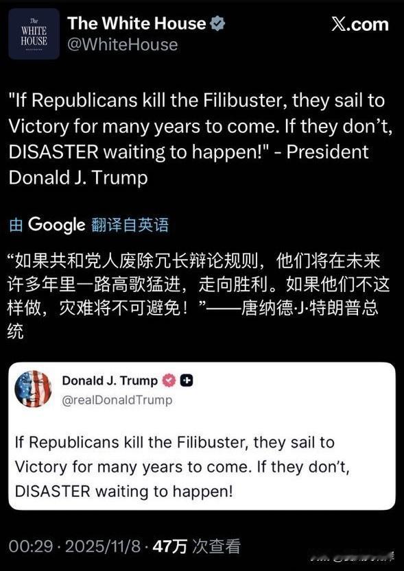川普发文要求共和党人废除冗长辩论规则,这样就能够在未来高歌猛进。白宫转发了该推文。 “如果共和党人废除冗长辩论规则,他们将在未来许多年里一路高歌猛进,走向胜利。如果他们不这样做,灾难将不可避免!”