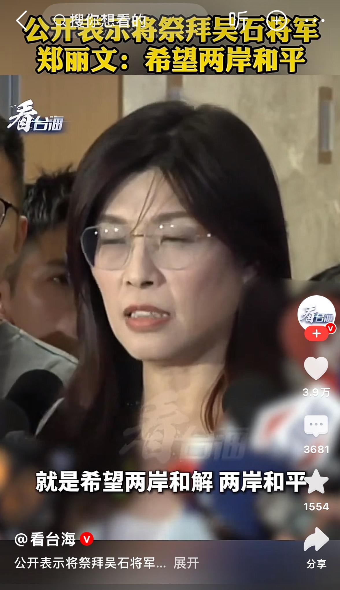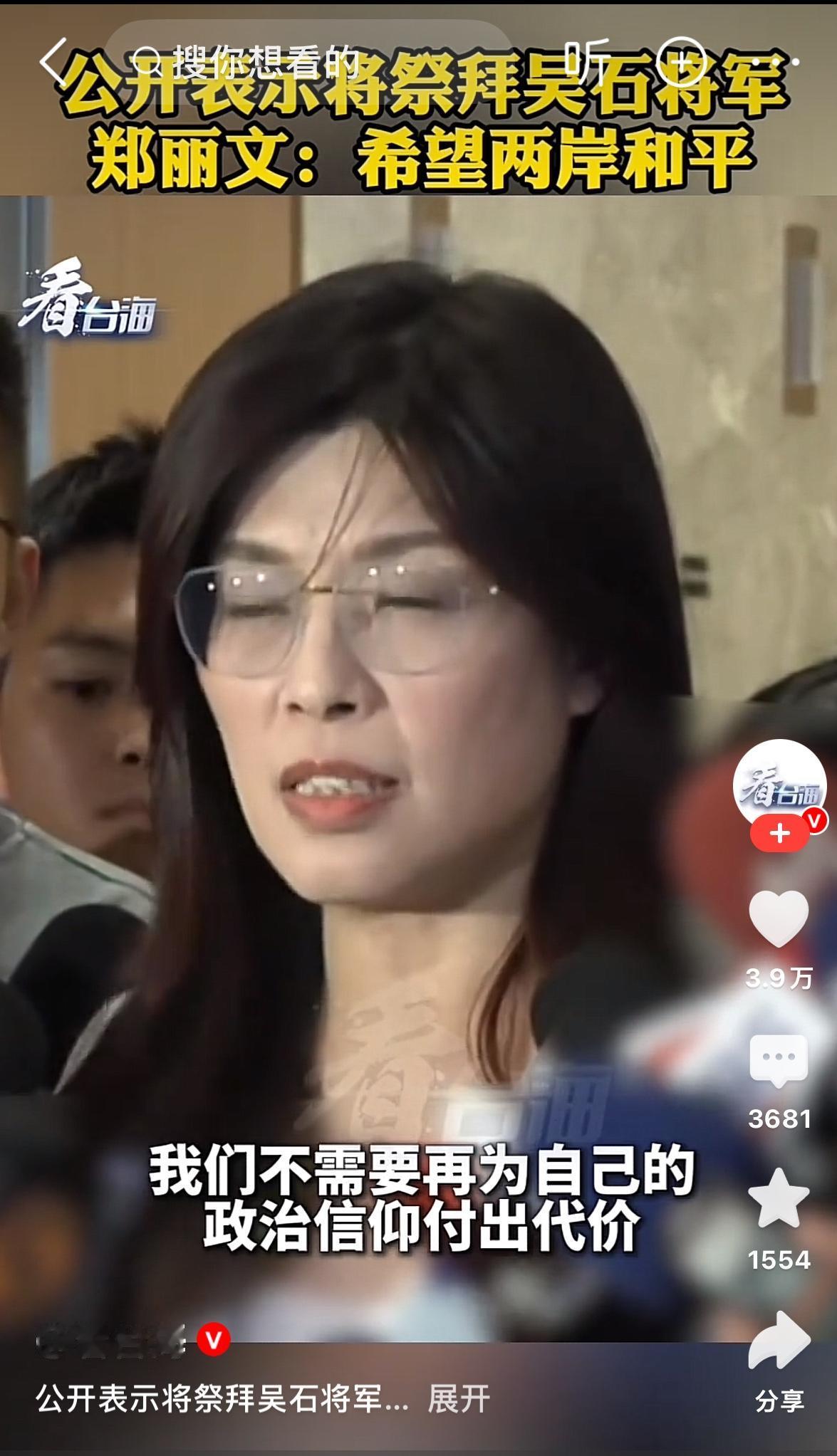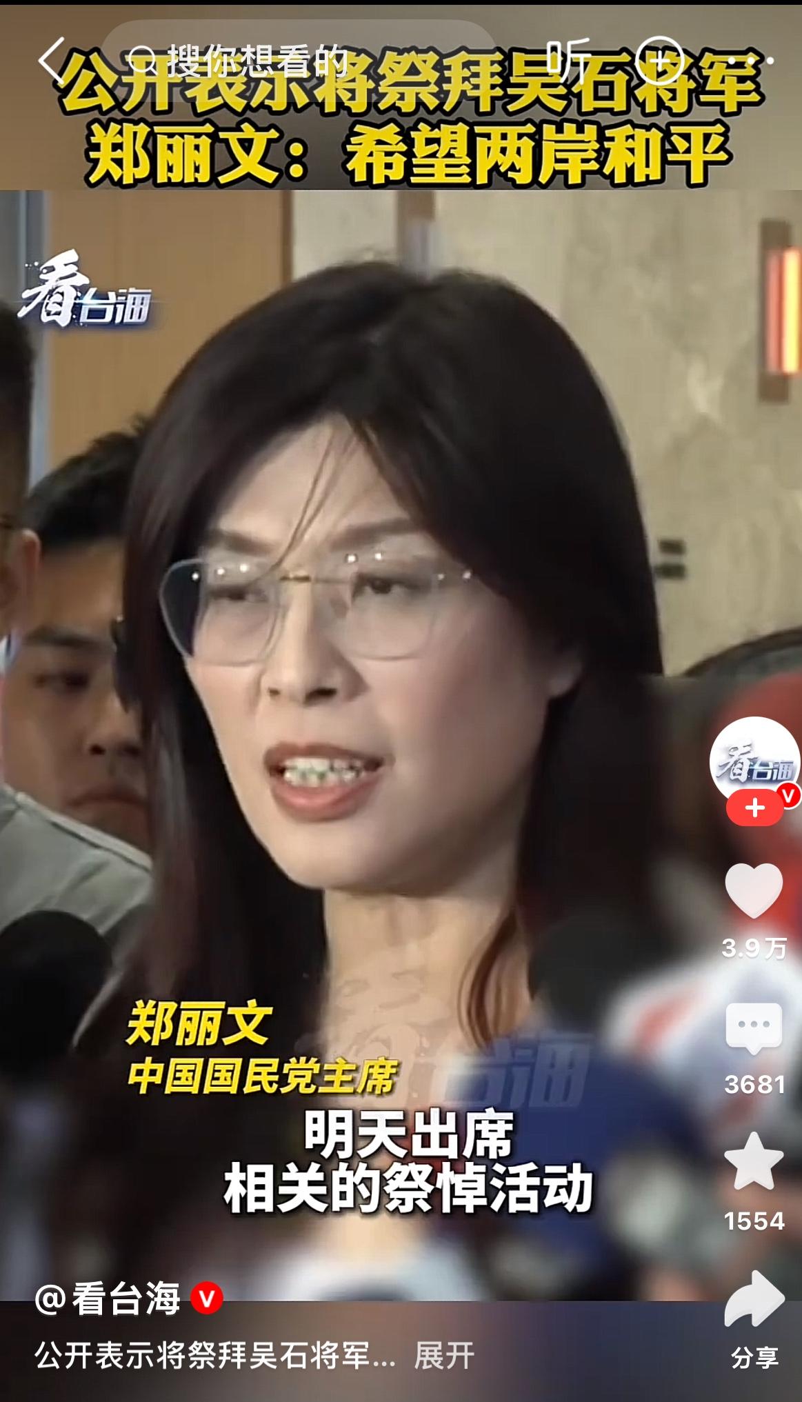 而作为国民党的党首,郑丽文从两岸和平统一的大义上公开表示祭拜吴石将军,这一步跨出是不容易的,其勇气胆识和非凡的决断是令人敬佩的! 如果成行,她的这一行动将在两岸统一的征程中被载入史册![赞]