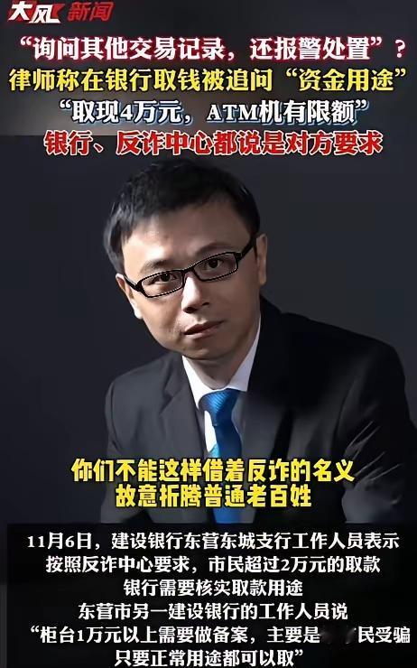 银行这次踢到了铁板。山东东营,一位律师想取自己的四万块钱,却被银行当成了嫌疑人盘问。这出荒诞剧,主角是周筱赟律师,配角是拿着“反诈”尚方宝剑的银行柜员。 “取钱干嘛?”一句简单的问话,瞬间把银行柜台变成了审讯室。柜员理直气壮,搬出“反诈中心”的大旗。周律师的反问直击要害:“你们是公安局吗?”这场景,像极了小品,却没人笑得出来。银行手握储户的钱,却行使着执法者的权力,这角色错位让人脊背发凉。 最讽刺的是,当舆论发酵,银行和反诈中心开始了一场精彩的“甩锅大赛”。反诈中心说:“没这规定。”银行坚称:“为了你好。”两边踢得欢,苦的是普通储户。他们就像被夹在中间的皮球,谁都想踢一脚。 周律师的较真,戳破了一个脓包。反诈是好经,可惜被歪嘴和尚念歪了。真正的骗子,早就编好了天衣无缝的故事,反倒是我们这些老实人,面对盘问时,一时语塞就成了“重点怀疑对象”。这种“宁可错杀一千,不可放过一个”的懒政,本质上是一种权力的滥用。 周律师不接受道歉,他要的不是个人面子,是所有人的里子。他要的是让银行明白,你的职责是保管和支付,不是审问和怀疑。取钱自由,这四个字写在纸上,不该被一句轻飘飘的“规定”就给抹掉。这场风波,该给所有手握一点点权力的人敲响警钟:别把“为你好”变成“耍你玩”。