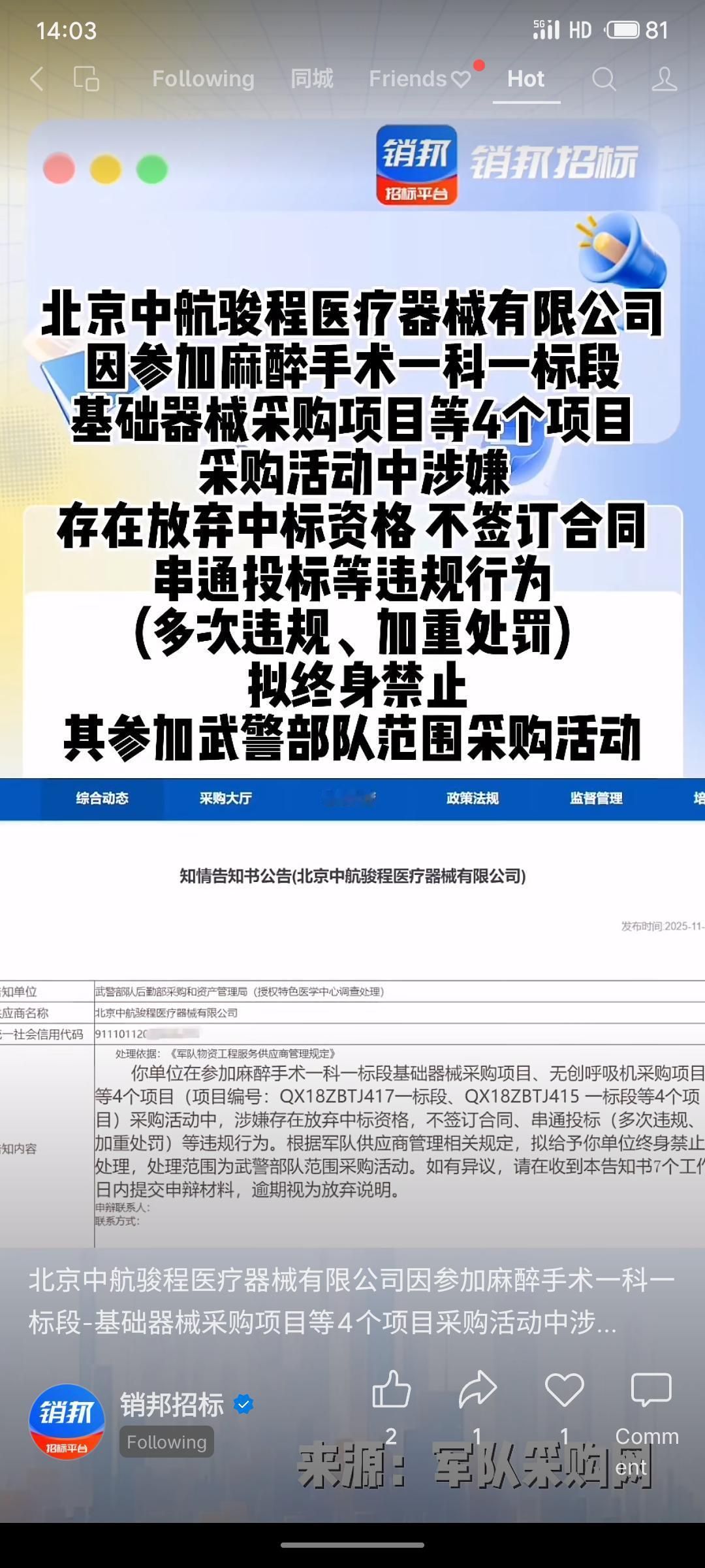 北京中航骏程医疗器械有限公司因在多个项目采购中串通投标、放弃中标并拒绝签约等多次违规,被拟终身禁止参加武警部队采购活动。