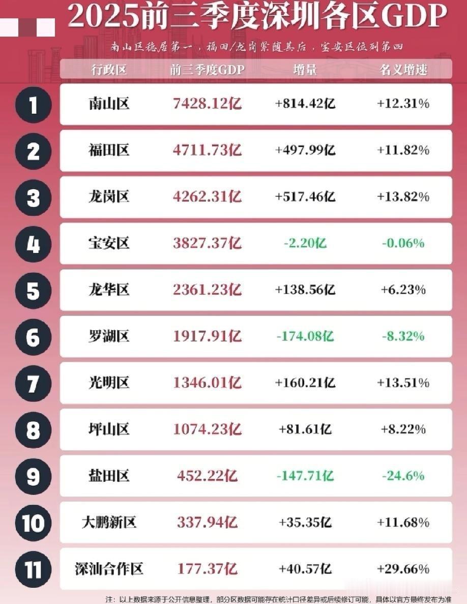 深圳2025年前三季度各区经济发展表现水平情况,深圳南山区前三季度经济增长量最高,南山区前三季度经济增长量达到了814.42亿元人民币,深圳的网友们可以看看自己所在区前三季度经济发展水平情况怎么样。