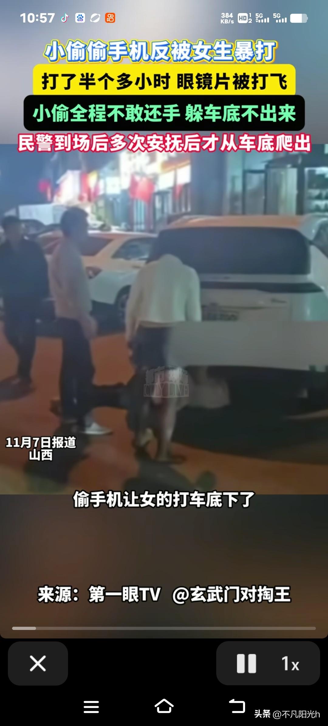 山西街头最近出了个狠人!一女生追着小偷使劲揍,连人家眼镜片都给打飞了——这年头小偷也太惨了,专挑好欺负的下手,结果这次踢到钢板上,栽了! 前几天山西的街上,上演了出特别带感的戏码:一个小偷瞅准女生手里的手机,正伸手想偷呢,还没等碰到手机,就被姑娘一个干净利落的过肩摔直接撂地上了。旁边有人拿手机拍了下来,视频里能看见女生拎着书包就追上去了,边追边使劲揍,小偷的眼镜片“啪嗒”一声飞出去老远,最后吓得钻到停着的车底下,声音都发颤:“警察叔叔,救命啊!”民警来的时候脸都绿了,跟哄小孩似的劝了快十分钟,才把那钻车底的主儿拽出来。 网友都炸锅了:“这姑娘身手,感觉没少练散打的样子!”还有人调侃:“现在小偷也太难混了,出门得先翻《普通人战斗力自测表》。”评论区更是玩梗玩疯了:“建议全国小偷集体来山西报个班,能扛住姑娘三巴掌的才算及格!” 这事也给咱们敲了个警钟:可别以为谁都好欺负,老实人发起火来也能当“猛虎”。你看那姑娘书包抡得跟鞭子似的,呼呼带风,平时估计没少在健身房举铁、跑步。所以啊,不管男女老少,练个好身板真不是瞎耽误功夫,关键时刻能救命。下次再让我知道哪个不长眼的小偷敢伸手,我保证……你猜我会不会抄起书包追着揍?