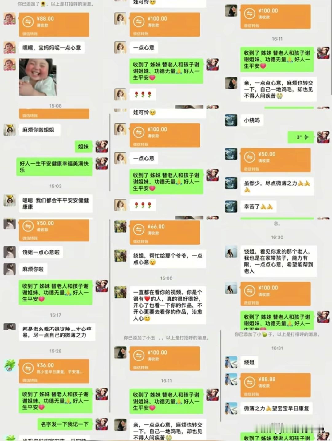 这一幕真是狠狠打了某某字会的脸啊!起因是昆明一位博主带孩子在医院看病的时候,发现隔壁床一位满头白发面容憔悴的老人带着一岁的小孙子在住院,老人虽然自己穿的衣衫褴褛面如枯槁,到小孙子却被他养得白白胖胖,穿得也干干净净! 博主以为是孩子的父母在外务工不能回来,聊天中才得知孩子的父亲在去年车祸中遇难了,一个月后孩子的妈妈也离家出走了,当时孩子才刚满三个月! 就这样74岁的老人承担起了抚养小孙子的重任,一边要做事养活自己,一边还要照顾嗷嗷待哺的孙子,其中的心酸尽在老人那黯然的双眼里! 而后博主把老人的事情发布到了社交平台上,没想到这一举动竟然引起了巨大轰动,网友们纷纷了解情况,接着送来不少物资把病床周围塞的满满当当,更有不少网友纷纷转账给博主,让博主代为转交老人,有转几块的、几十的、几百的,看着博主晒出的转账记录和做账笔记,满满的都是感动,明明都是素不相识又从未谋面的陌生人却纷纷伸出援手,人们的善意穿越了地区和风雨来到老人身边,照亮了他黯然失色的双眼! 这一幕真是最大程度的打了某某字会的脸,大家不是冷漠,不是没有爱心不愿意捐款,而是大家要看到自己的爱心落到实处,看到真正需要帮助的人得到帮助,而不是让自己的善意石沉大海!