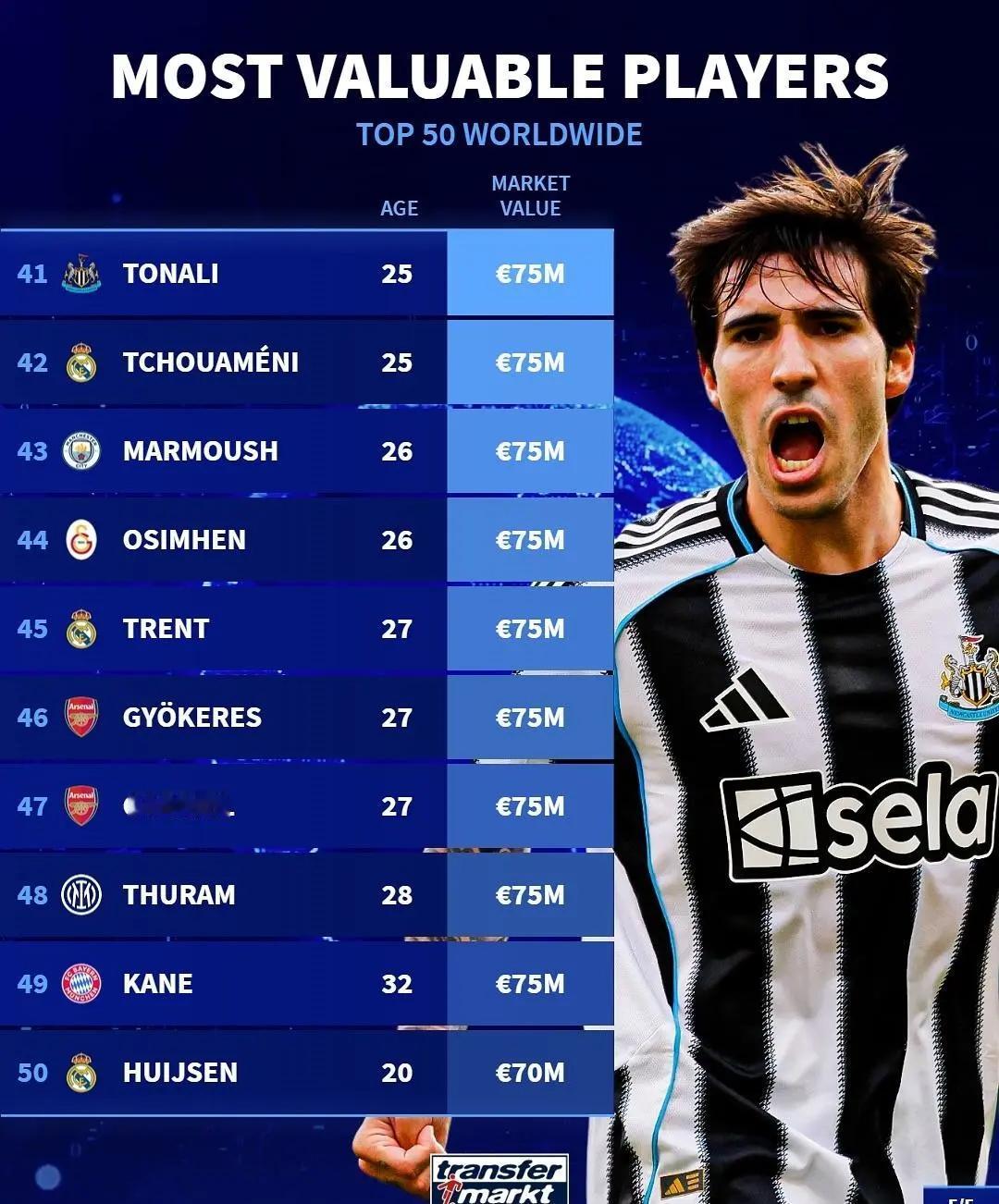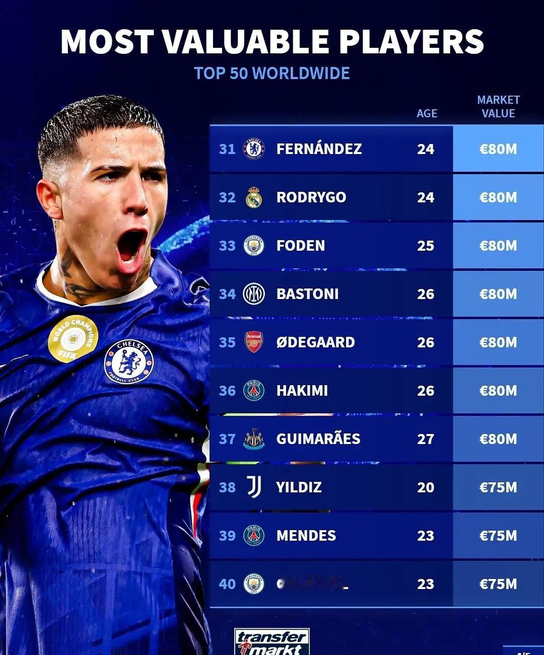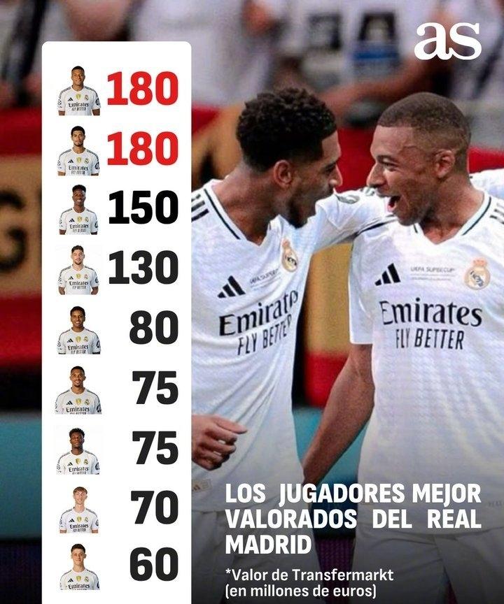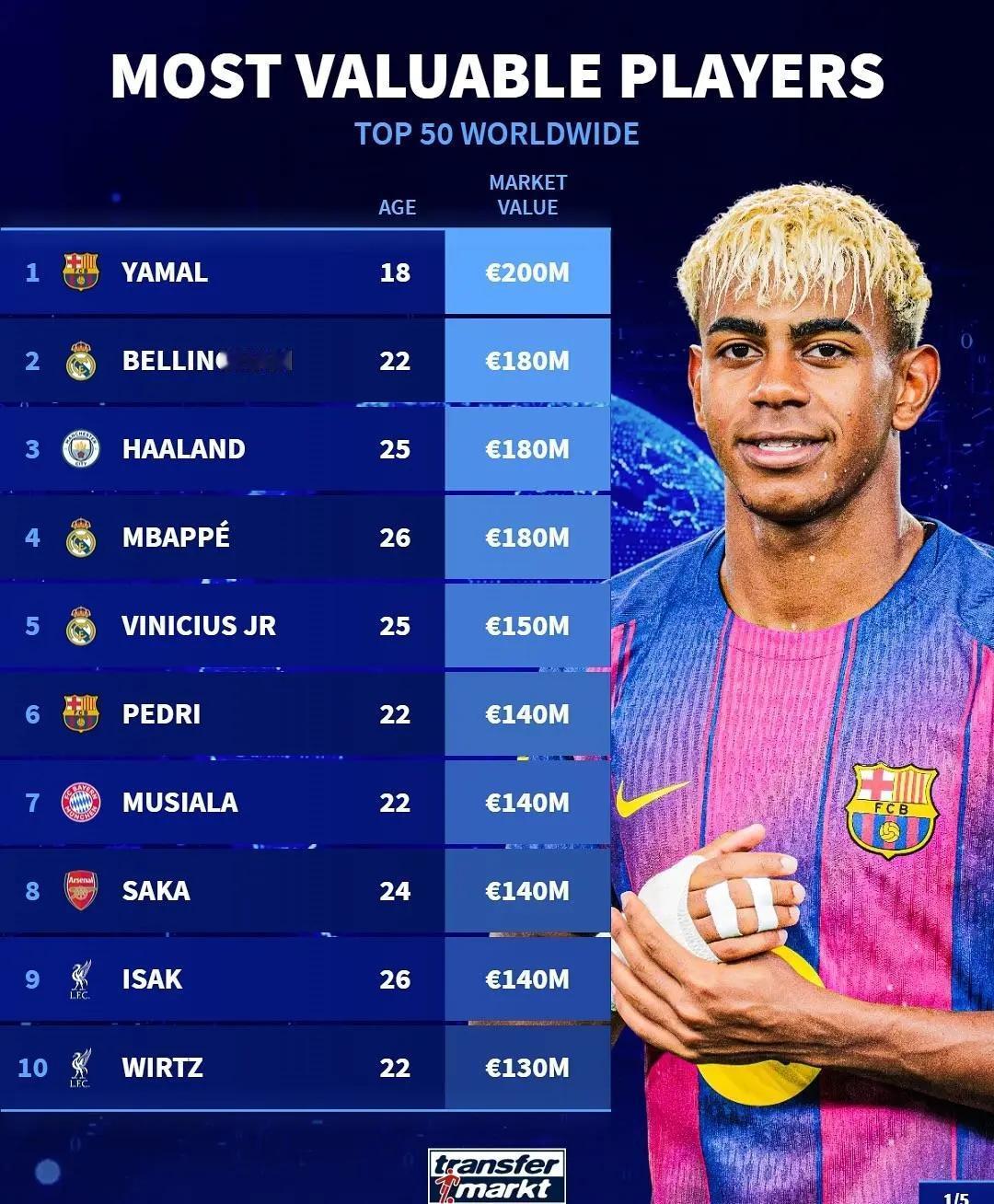 德转身价变化! ★世界足坛身价Top50! 身价过亿的球员目前有18位,达到2亿的只有亚马尔一人,利物浦挺尴尬,两名球员排名前十,但作用却和身价严重不符。 ★国家队德转身价排名! 意大利国家队球员总身价排名世界第六,这要是还进不去世界杯,岂不是尴尬×3。 ★皇马球员身价! 皇马几位明星球员的身价下降的很快啊。 ★2025年非洲年度最佳球员候选人身价榜。 大巴黎的阿什拉夫身价最高。