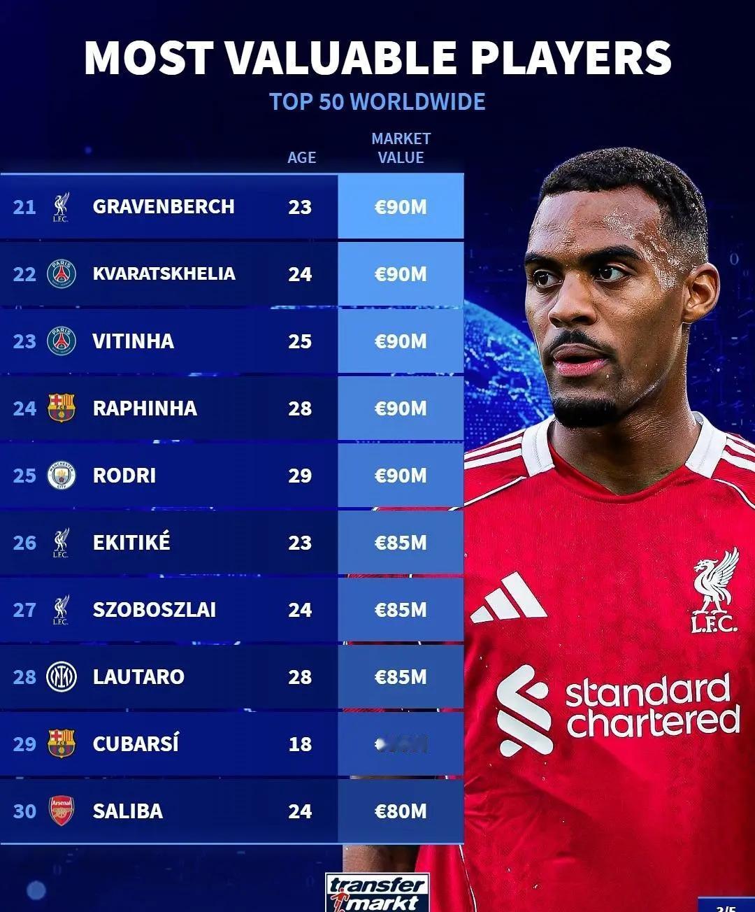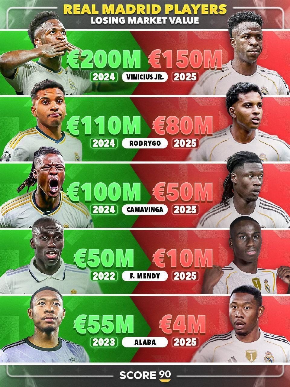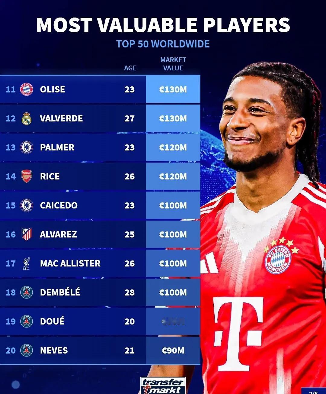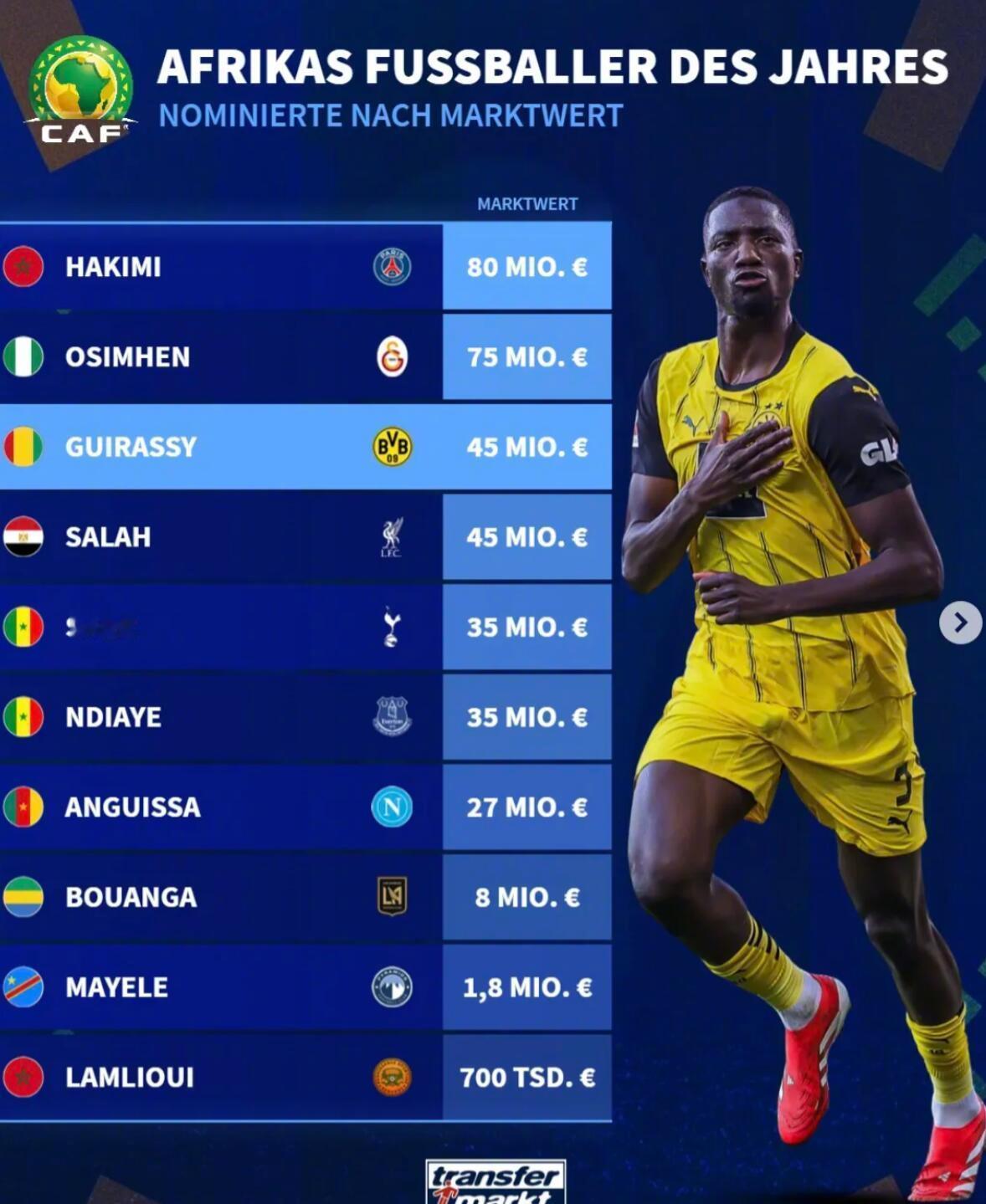 德转身价变化! ★世界足坛身价Top50! 身价过亿的球员目前有18位,达到2亿的只有亚马尔一人,利物浦挺尴尬,两名球员排名前十,但作用却和身价严重不符。 ★国家队德转身价排名! 意大利国家队球员总身价排名世界第六,这要是还进不去世界杯,岂不是尴尬×3。 ★皇马球员身价! 皇马几位明星球员的身价下降的很快啊。 ★2025年非洲年度最佳球员候选人身价榜。 大巴黎的阿什拉夫身价最高。