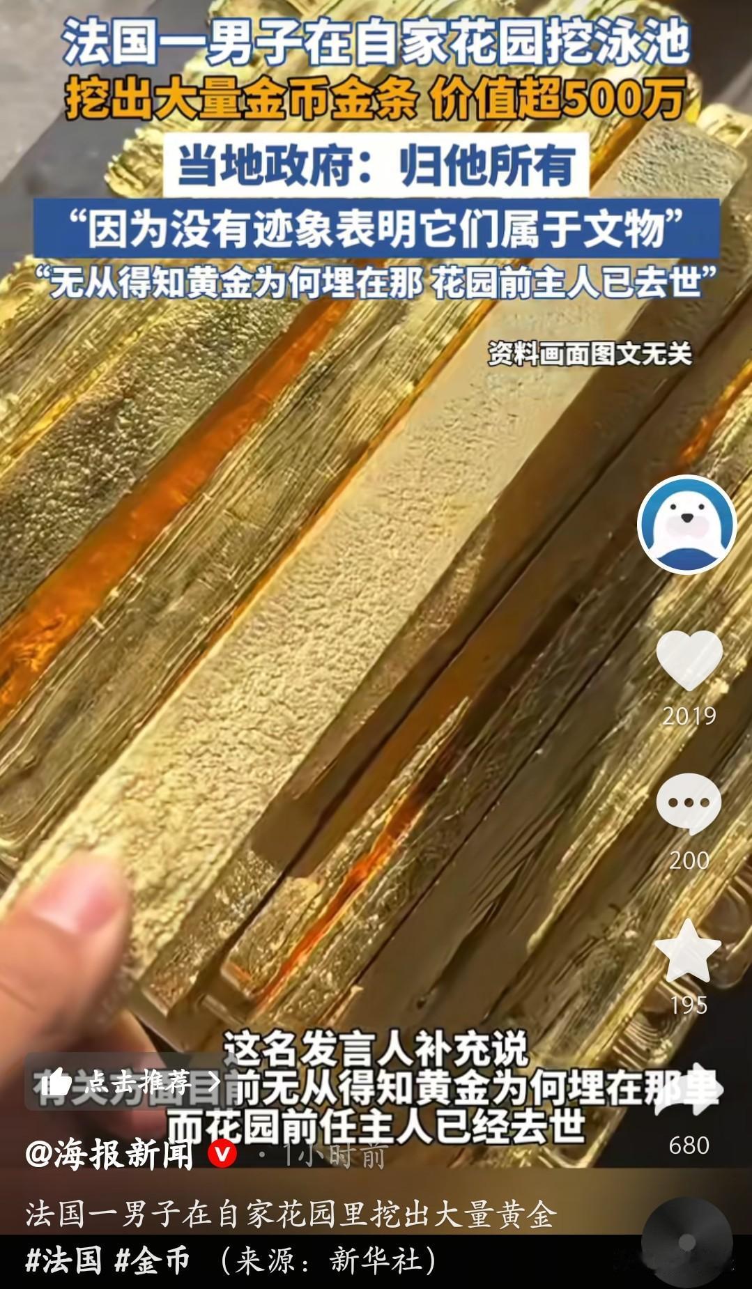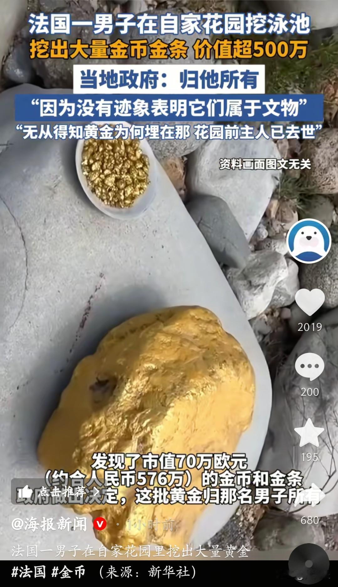 挖泳池挖出500多万的金子?这法国大哥运气绝了! 自家花园刨土建泳池,一铲子下去掏出一堆金币金条,市值70万欧元(快600万人民币)。最离谱的是政府说“归他了”。因为这不是文物,前主人也没了,找不着主儿。 这哪是挖泳池啊,明明是开盲盒开出“终极隐藏款”!网友都酸了:我家花园刨三尺,除了土就是石头,人家一挖直接财富自由…这运气,怕不是祖上积了八辈子德?