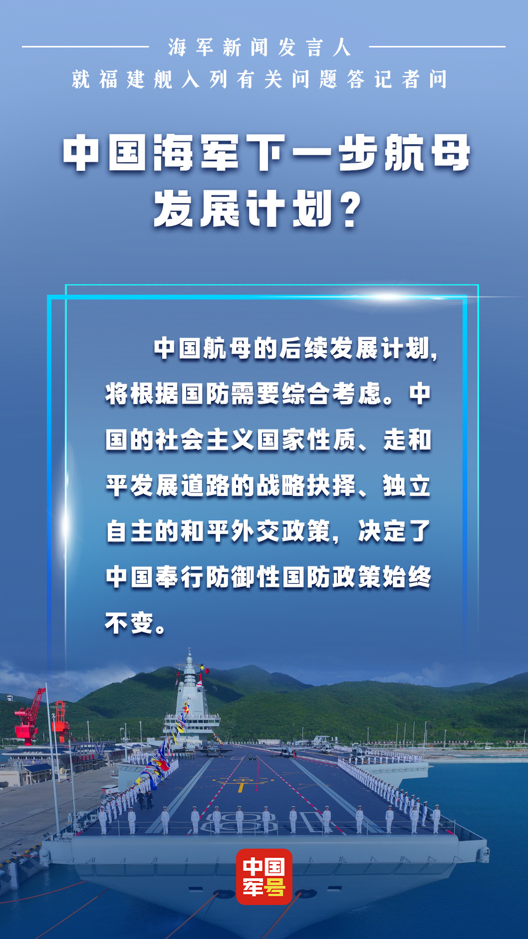 在回答关于中国海军下一步航母发展计划时,冷国伟表示,中国发展和改进武器装备,不针对任何国家和特定目标,不会对任何国家和地区构成威胁,完全是为了维护国家主权、安全、发展利益。对于中国航母的后续发展计划,将根据国防需要综合考虑。需要强调的是,中国的社会主义国家性质、走和平发展道路的战略抉择、独立自主的和平外交政策,决定了中国奉行防御性国防政策始终不变。