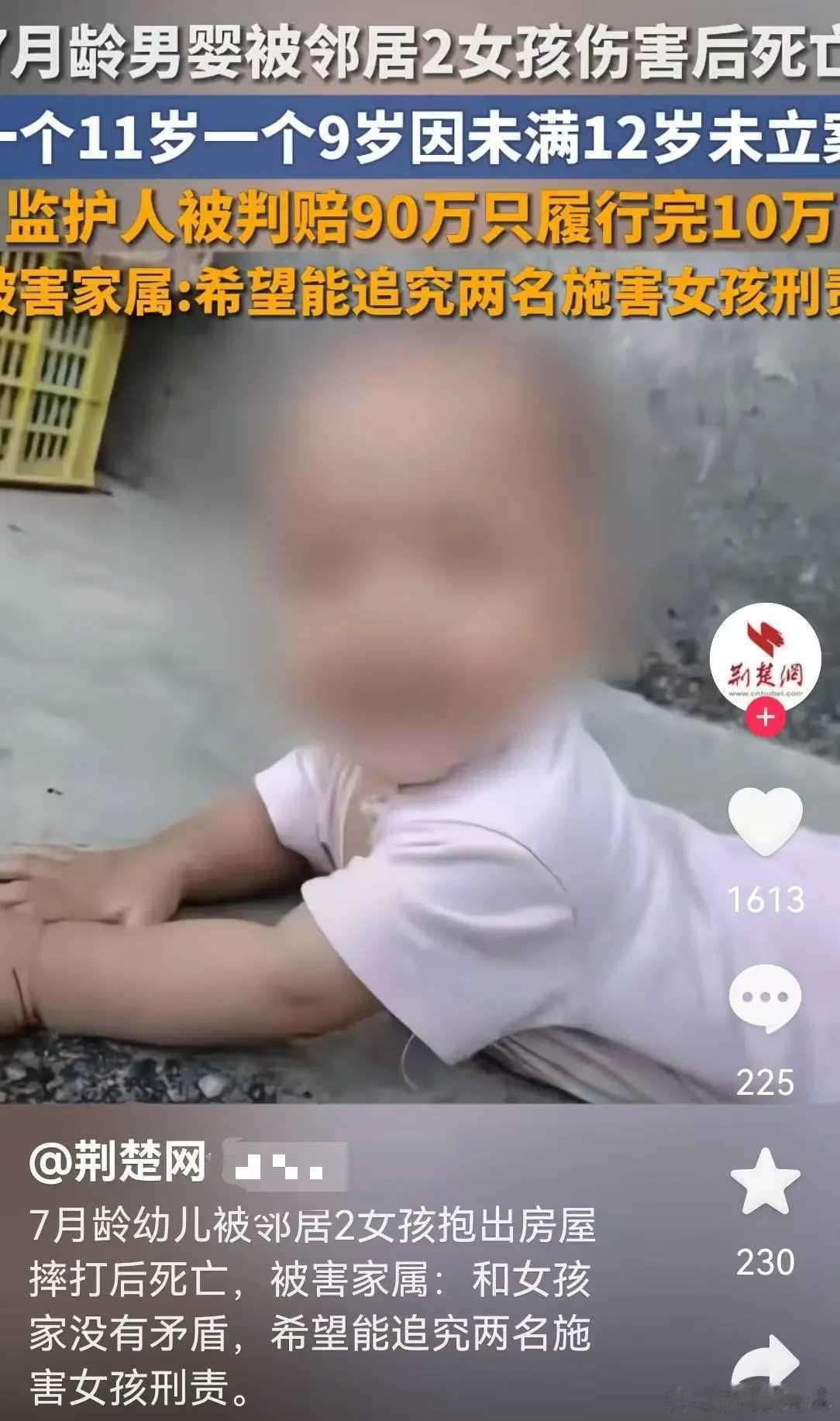 广西百色七个月大的婴儿被害案引发网友关注,凶手是两个未成年人女孩,一个9岁,一个11岁。神奇的是:她们不用负责[怒][怒]