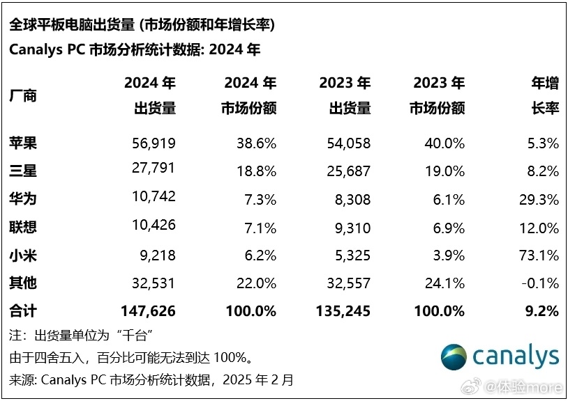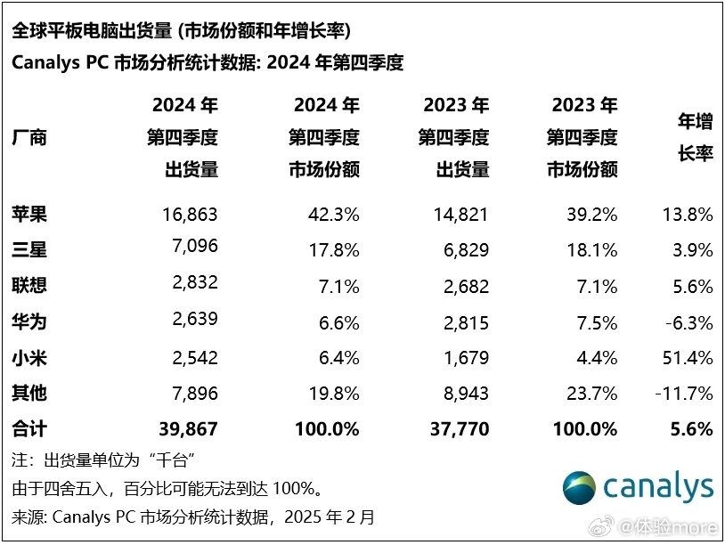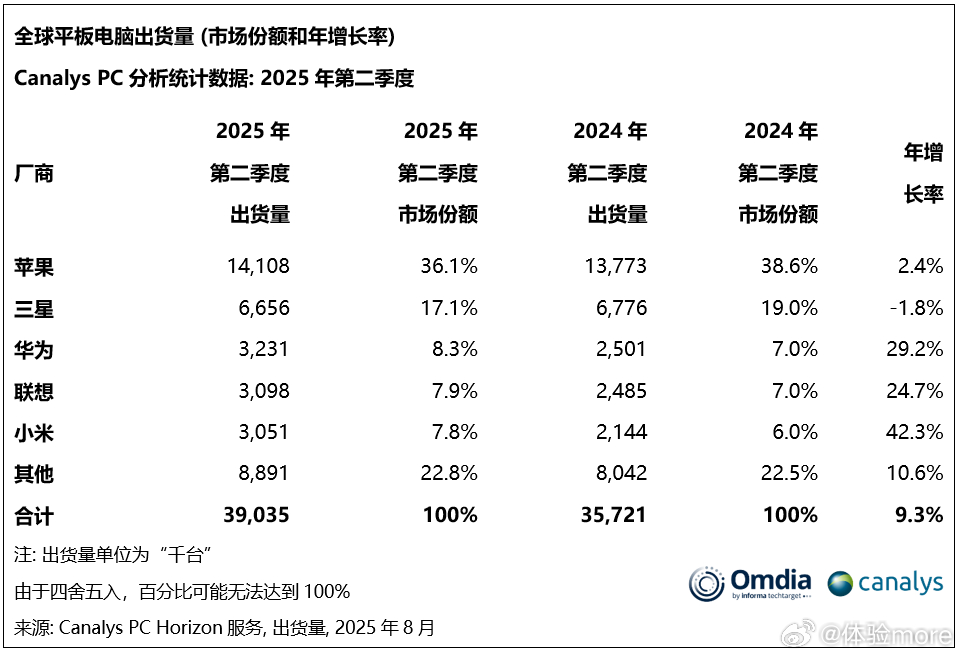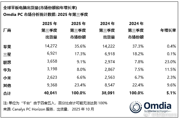 苹果、三星依然是稳稳的前2,联想由于商用平板业务的扩张份额大幅增长,重返前3。小米增速放缓,维持在全球第五。