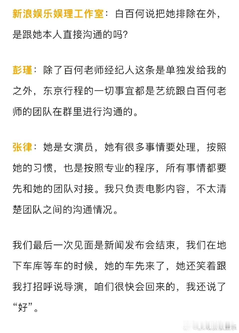 结合一下白百何的过往事迹,感觉还是张律的可信度比较高。 导演张律说有微信记录可以证明,他通知了白百何经纪人,白百何经纪人还回了信息。 就凭这一点,就可以确信张律确实通知了,有没有聊天记录很好核实,这点谁也不会公然说谎,不然太容易被拆穿了。 现在就看白百何怎么应对了。