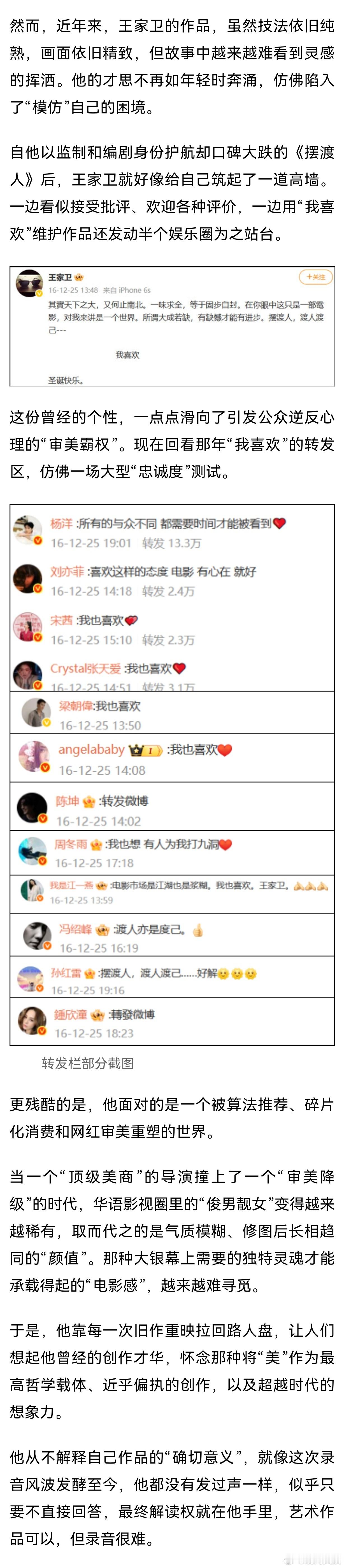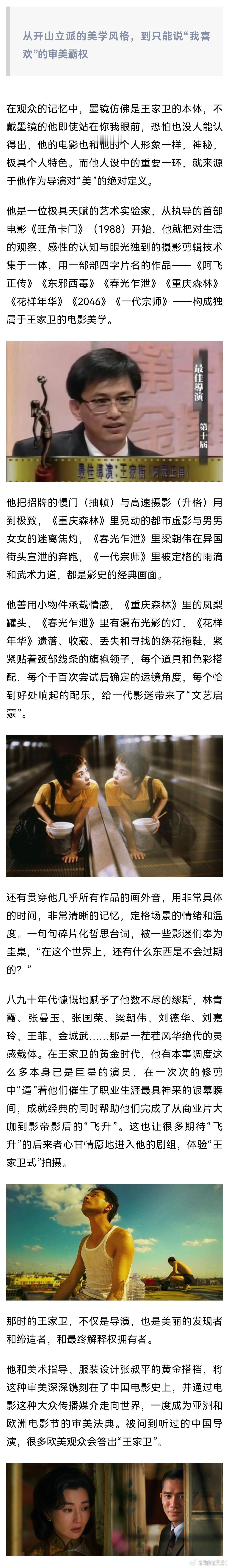大家开始不再无条件地仰望那副墨镜,而是更想直视镜片后的眼睛。王家卫的人设,也从一个被作者权威无限抬高的艺术神话,逐渐变成一个可以批评,甚至被打上“剥削”年轻人标签的职场“老登”。