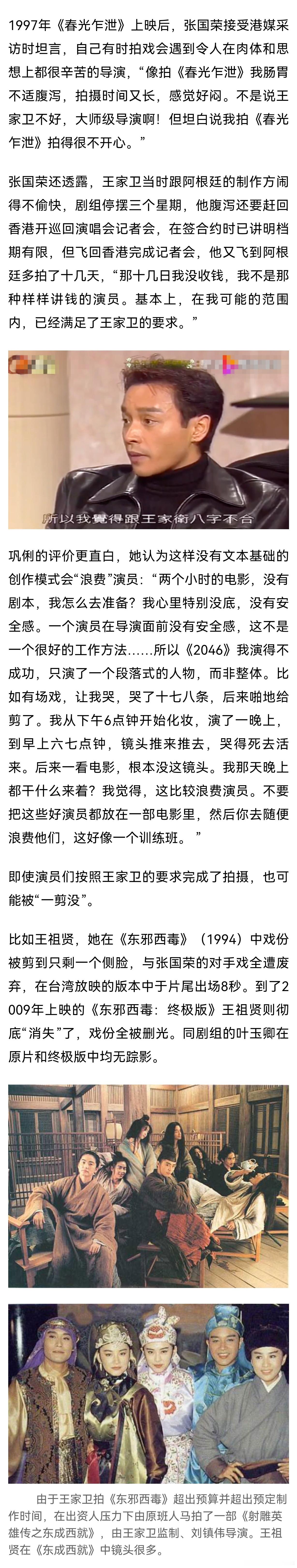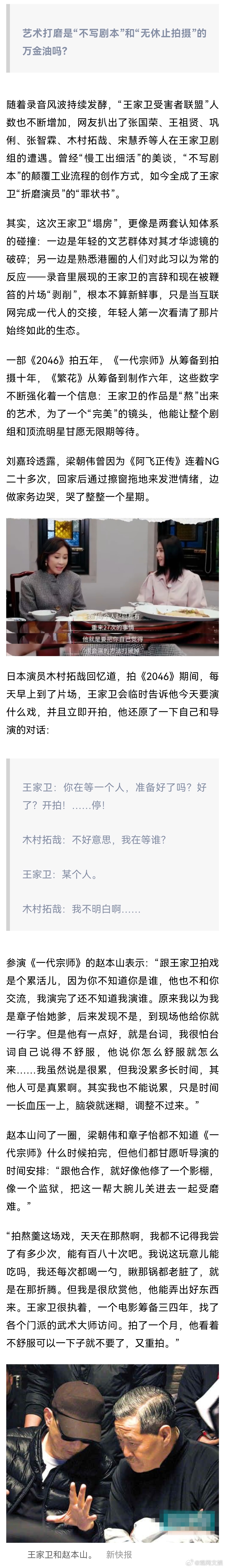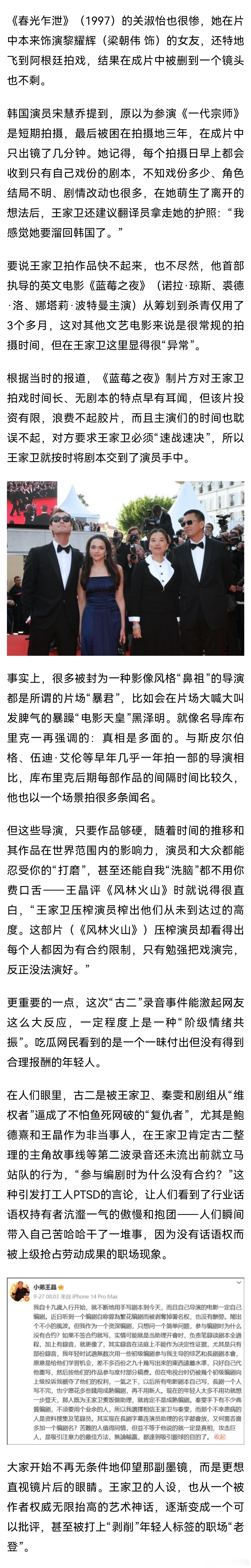 吃瓜群众没有一竿子打死王家卫过往的艺术成就,而是审视其中的“剥削”行为。这位开辟独特影像美学的文艺标杆,“不写剧本”“试图藏护照扣着演员”“让人一拍拍几年结果把人一剪没”的叙事,如今正面临“反噬”。