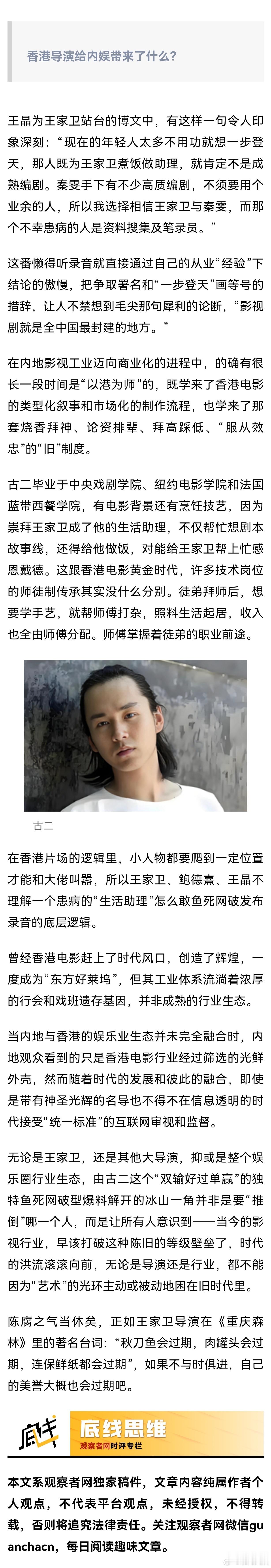无论是王家卫,还是其他大导演,抑或是整个娱乐圈行业生态,由古二这个“双输好过单赢”的独特鱼死网破型爆料解开的冰山一角并非是要“推倒”哪一个人,而是让所有人意识到——当今的影视行业,早该打破这种陈旧的等级壁垒了,时代的洪流滚滚向前,无论是导演还是行业,都不能因为“艺术”的光环主动或被动地困在旧时代里。