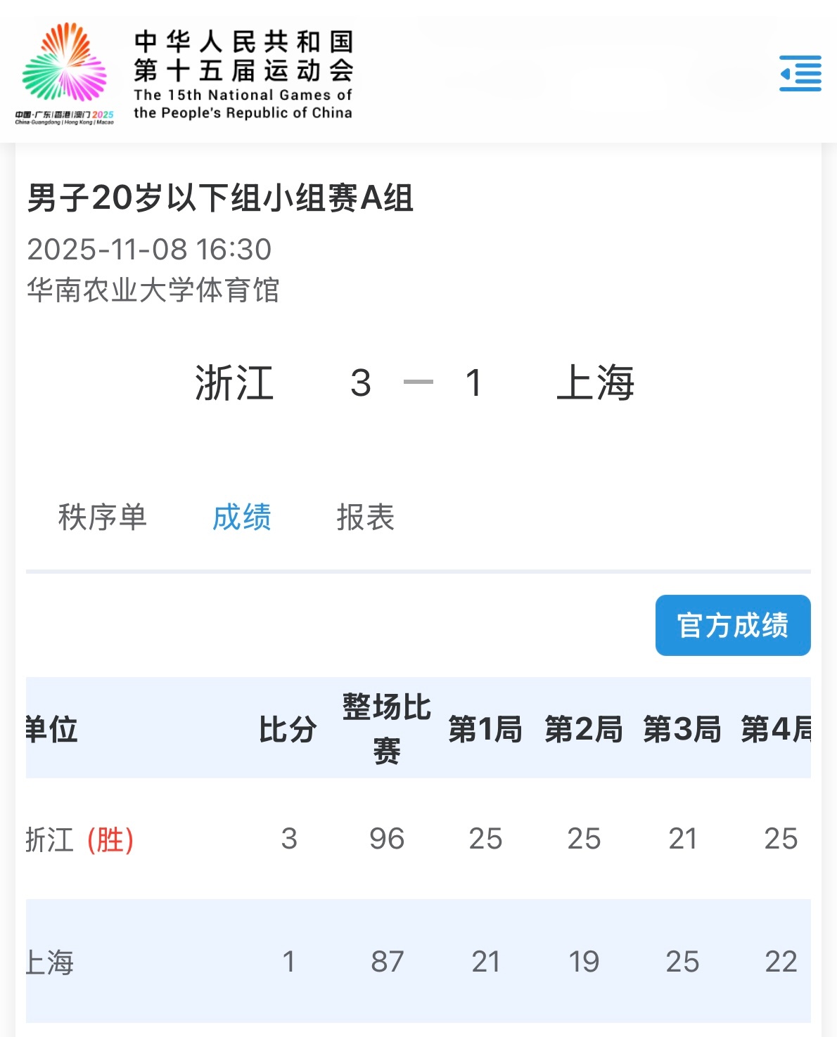第十五届全运会 全运会U18男排小组赛:浙江队3-0澳门(25-19,25-15