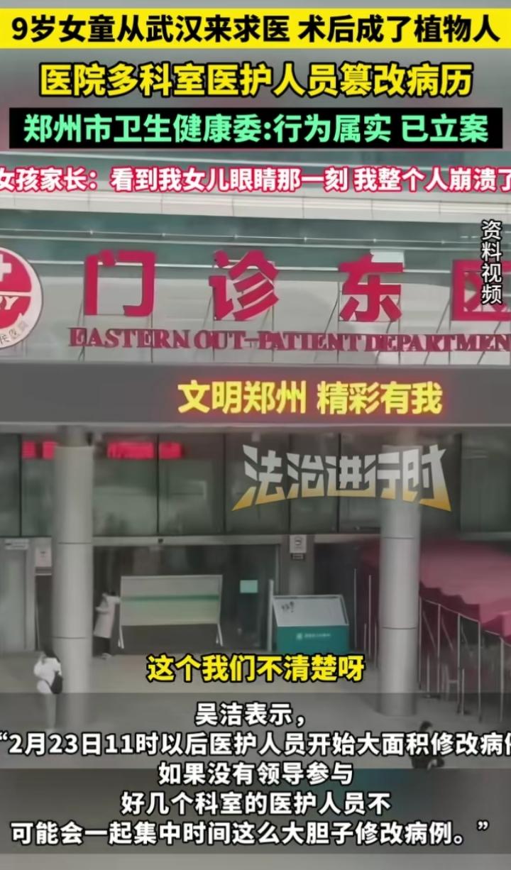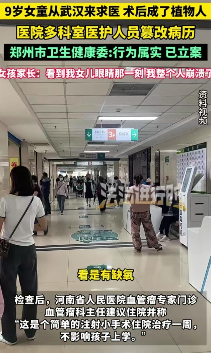 女童术后成植物人,医院忙着改病历,卫健委发言,属实已立案! 不得不服了这事件的“骚”操作!家属把小孩从武汉送到郑州就医!额…武汉的医疗水平不是更高吗?做手术不该就近吗?他们是怎么想的,难不成图便宜,(只是猜测)孩子手术也不应该呀。 还有就是医院修改病历!咋的啦,掩耳盗铃呀,这么大的疏漏是改病历就能遮掩过去的吗?没学过一个词叫做欲盖弥彰吗?为了名声医德都不要啦? 不过值得表扬的是当地卫健委,回复大众干脆利落:“行为属实,已立案!” 不过大众最关心的是最终处理结果,先还原下事情的真相吧,然后对事对人,谁做错谁问责,如果是涉案人员改的病历,是不是要从重严惩?您觉得呢?