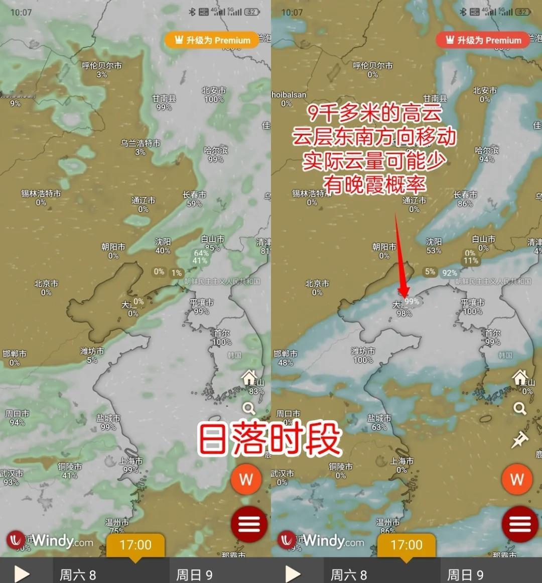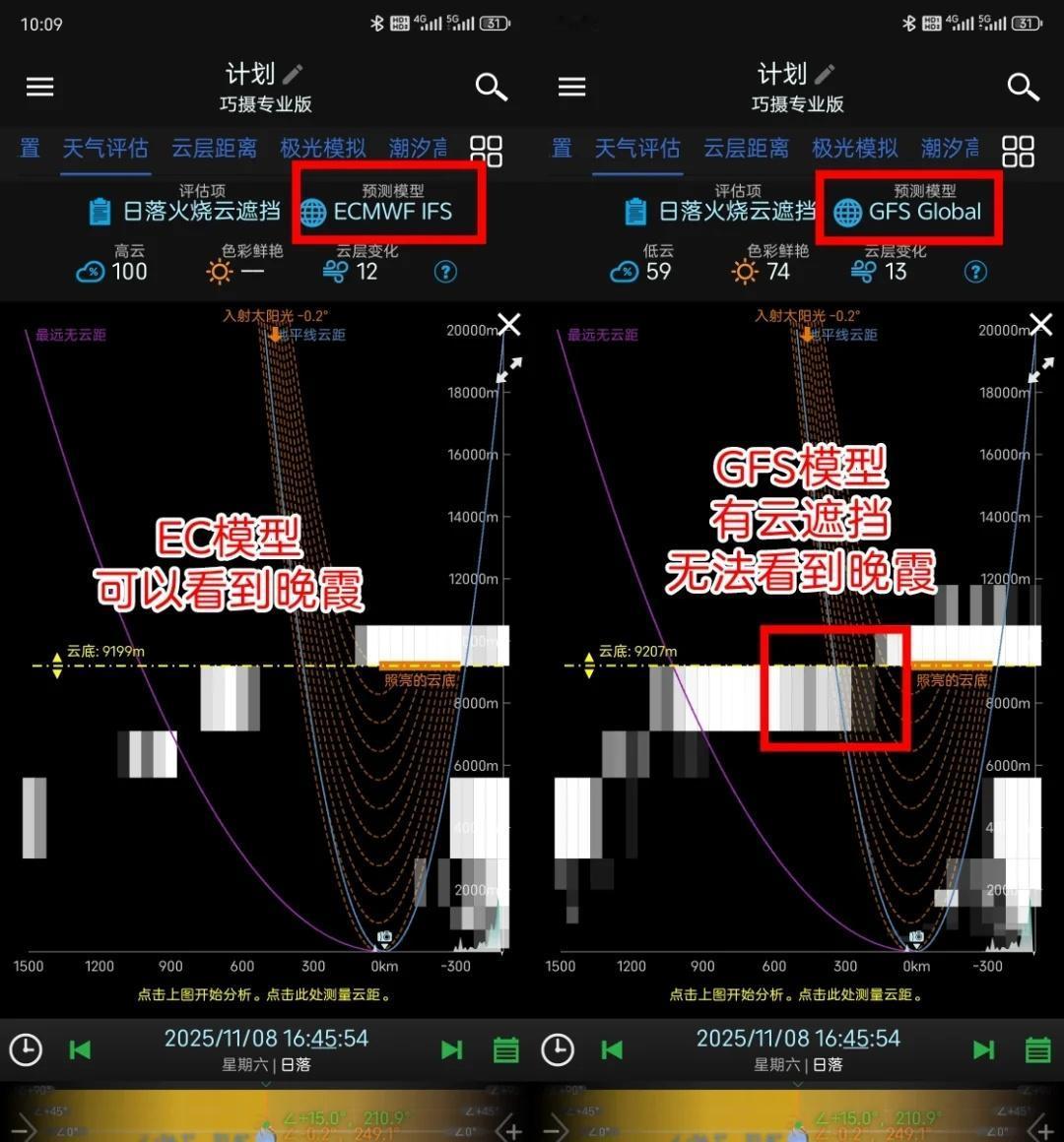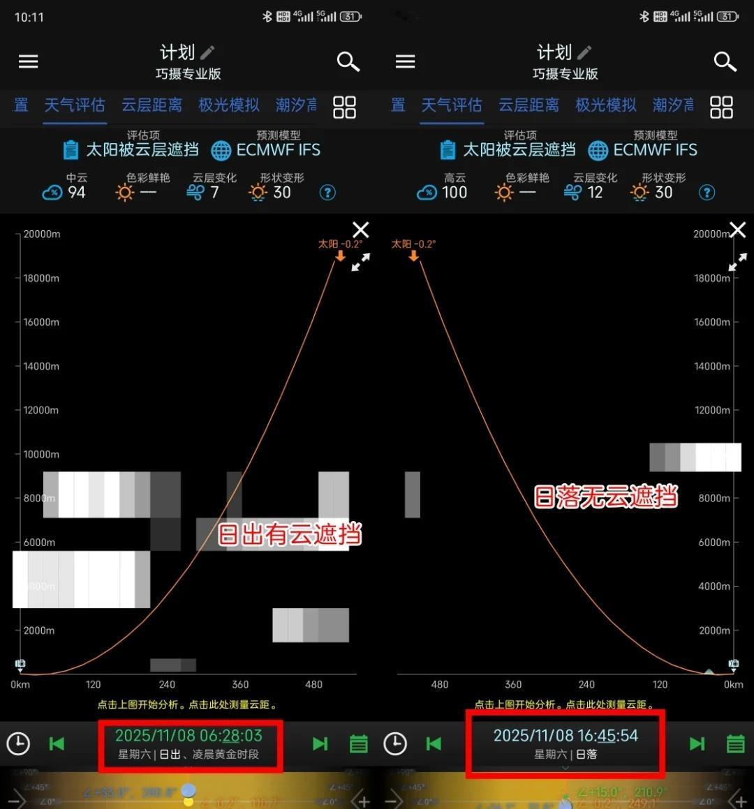 2025.11.8大连日出日落预报 卫星云图与预报对比,EC模型比较接近。 以EC模型预报为准来看云层。 日出时云量较多,遮挡太阳,基本看不到日出。 日落时云况还可以,根据预报,云层逐渐向东南方向移动,如果明天下午实际云量较少,云边界不遮挡太阳,会有晚霞。 图9-10,巧摄天气评估,如果明天云层与EC模型预报相符,傍晚会有晚霞。 看日落地点: 付家庄 银沙滩 金沙滩 跨海大桥观景点 莲花山 石槽 大连 大连旅游 大连拍照 日出日落观景点 日出日落晚霞大连同城