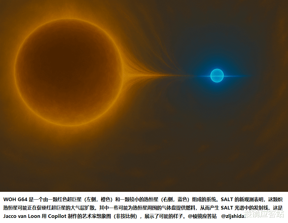 研究者范隆(JaccovanLoon)说,WOHG64可能从来就没真正离开红超巨星阶段,所有的异常,都是因为它的B型伴星干扰和遮掩造成的。