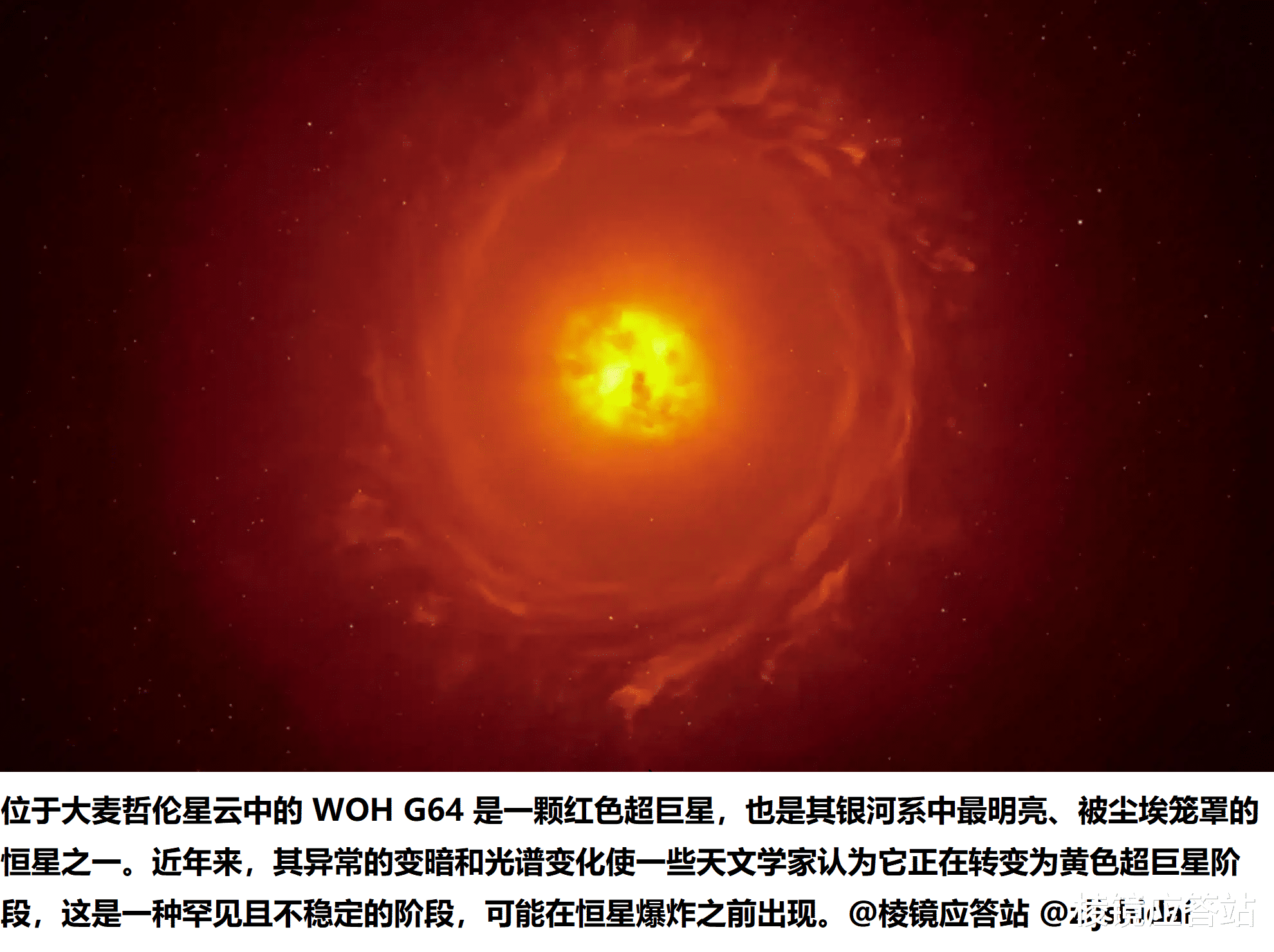 黄色特超巨星是一种特别不稳定的演化阶段,在宇宙里几乎一下子就没了,特别少见,它就好像人在快不行的时候出现的回光返照脸色从苍白变成潮红,看着更有活力了,可离死又近了一步,WOHG64的质量约为太阳的20倍,每年向宇宙抛洒的物质高达3.1至5.8×10⁻⁴个太阳质量,是已知质量损失率最高的恒星之一。