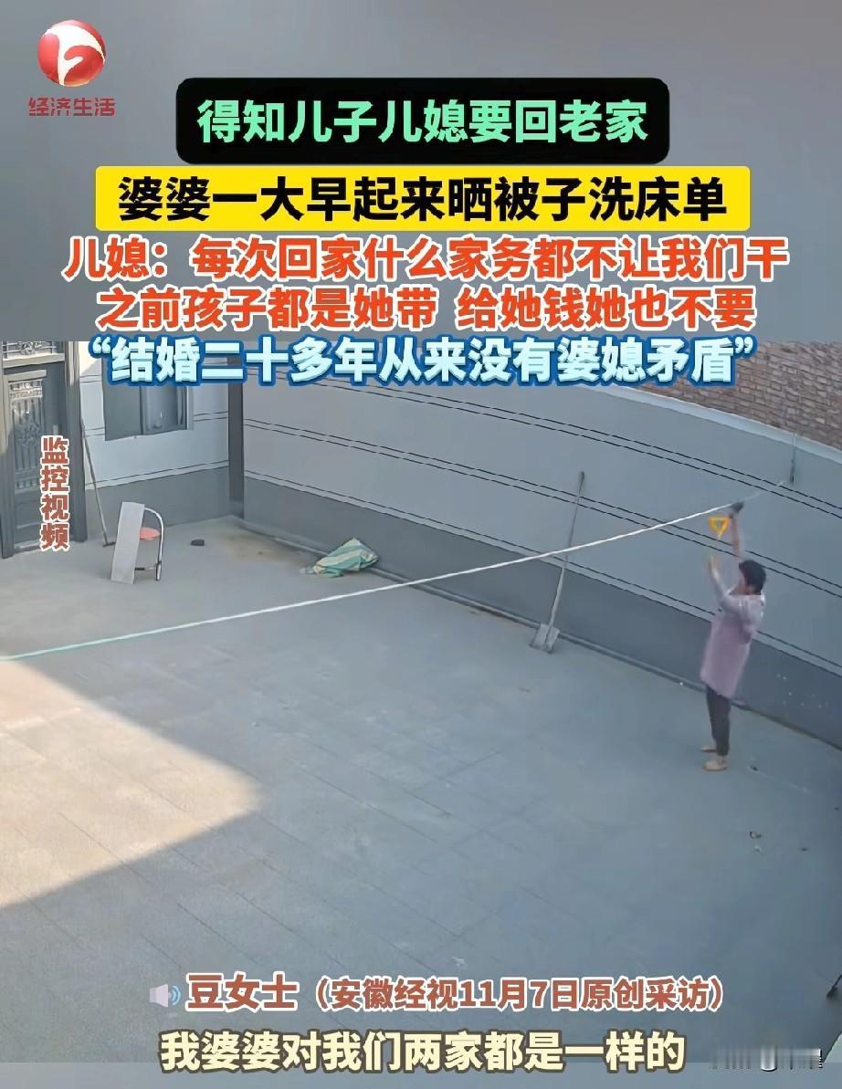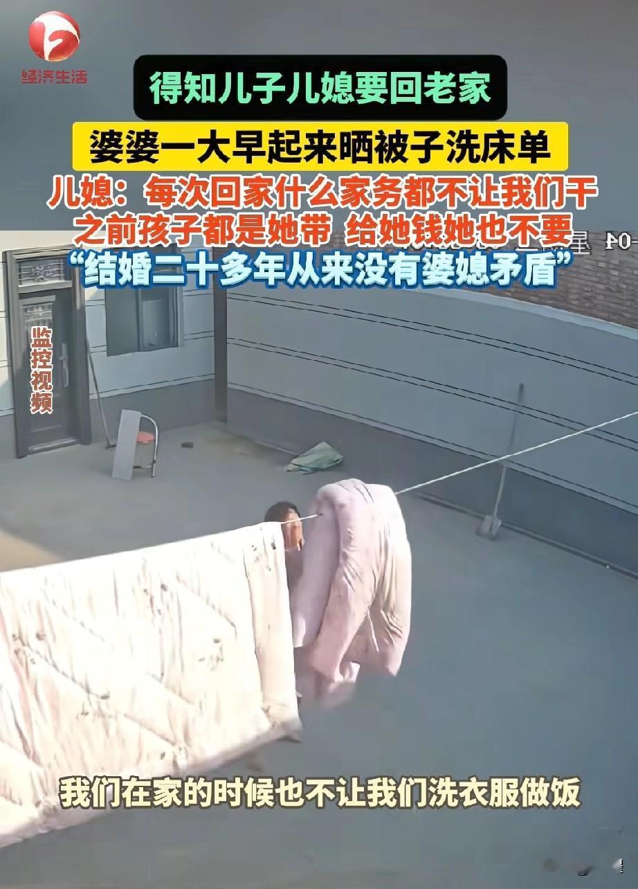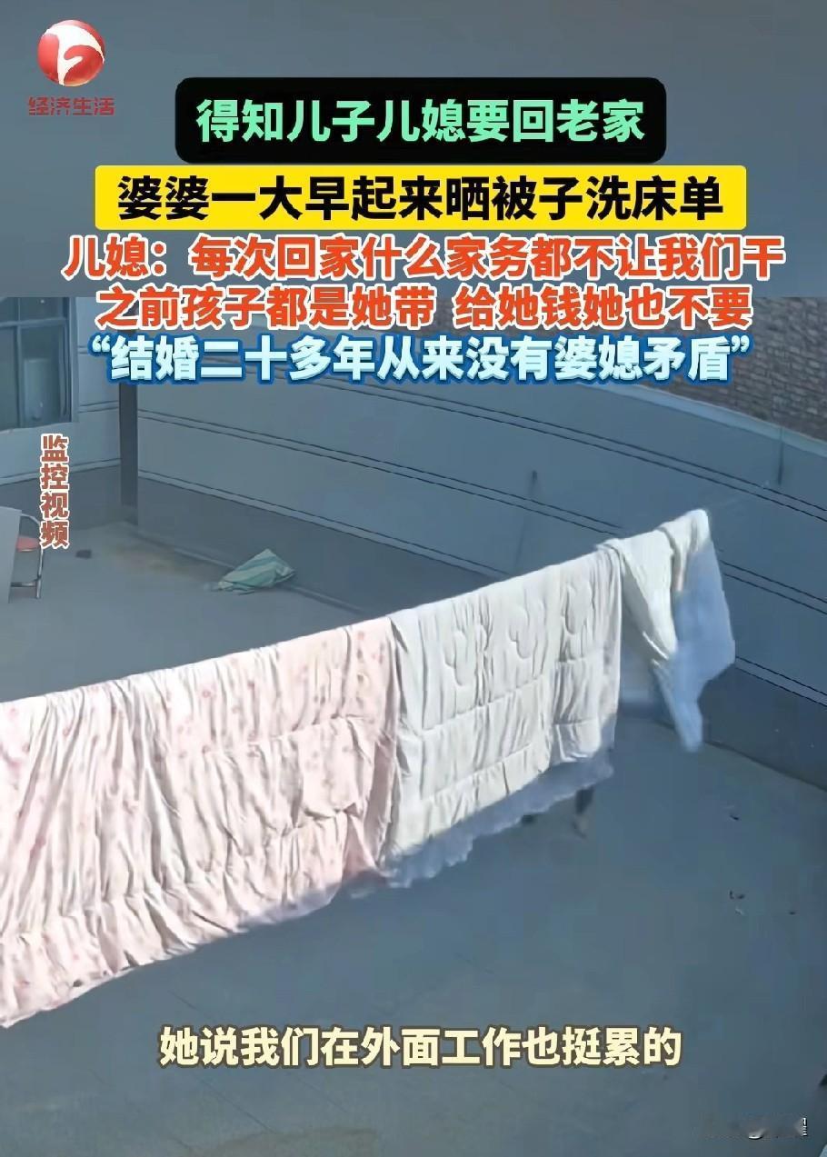 这画面也太暖了吧! 简直就是神仙婆婆呀。 知道儿子儿媳要回家,婆婆天不亮就爬起来晒被子洗床单。 儿媳说结婚二十多年没红过脸,婆婆带娃、做家务,是真把儿媳当自家人疼。 你心疼我带娃辛苦,我体谅你上班奔波,婆媳之间的暖,从来都是双向的。 有人肯真心付出,有人懂珍惜感恩。 能遇到把你当孩子疼的婆婆,回家能当个不用干活的“小孩”,是最实在的幸福了。 这样的家庭氛围,真的暖到心坎里。 婆婆 婆婆的节俭生活 婆婆家的地位 通情达理婆婆 爱攀比的婆婆 高情商婆婆 婆婆夸衣服 人间最美婆婆