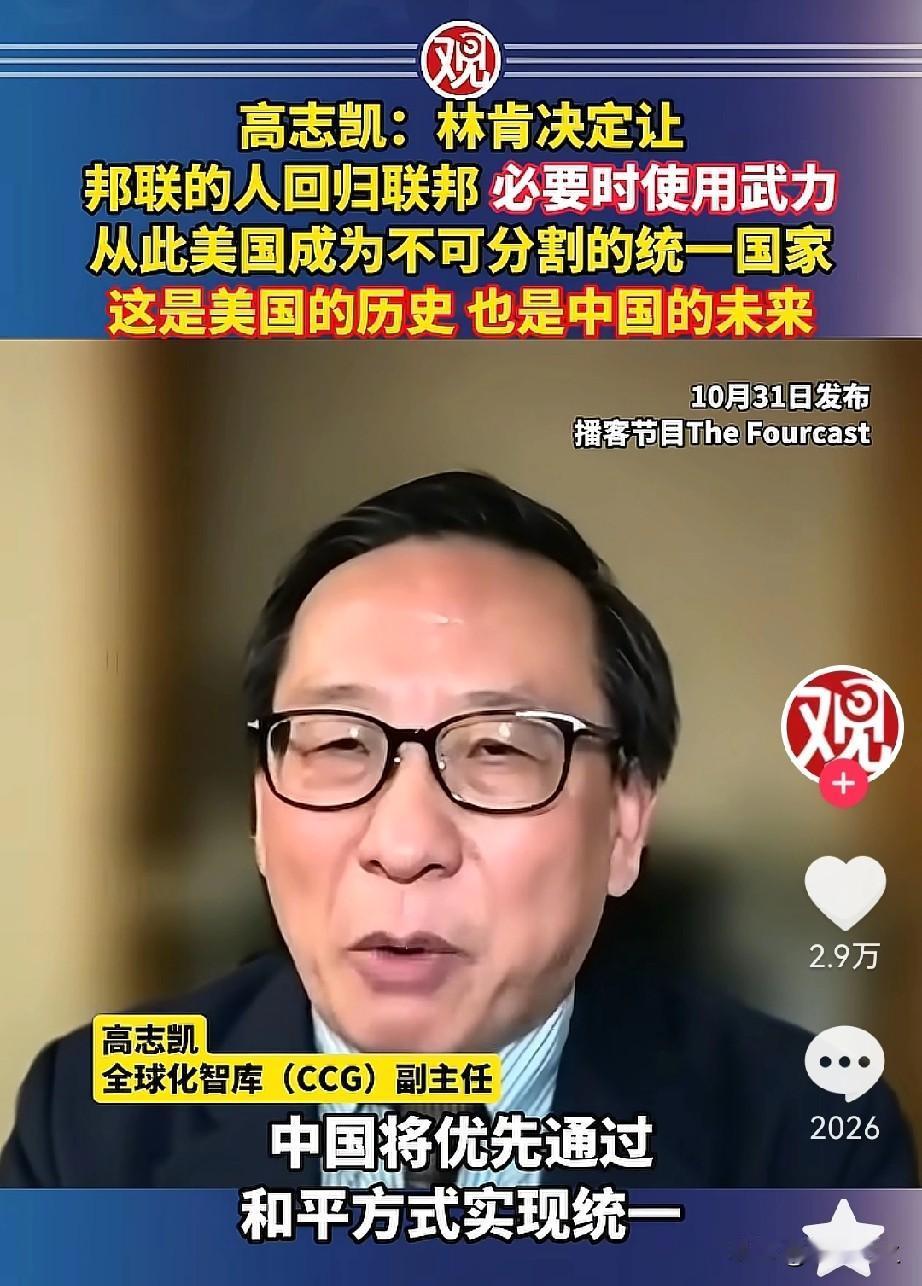 电视节目里的高志凯教授,给所有想看中国学者硬气发言的观众上了一课,那就是跟人讲理别绕弯,用对方的历史当镜子照双标,你就是最有力的反驳! 高教授是耶鲁法学博士,当过外交官见过大场面,早年还给邓小平同志做过翻译,看问题准说话有根。 这次美国学者扯台湾人意愿,他直接搬出美国1861年内战的事,南方要独立林肯没惯着,打了四年统一。 你说尊重意愿?林肯那会儿咋不尊重南方?你说不能动武?林肯咋不放弃武力? 那些总拿台湾说事儿的人,自己家统一时都是武力动过手解决的,倒不许家别人维护主权? 这是哪门子道理!双标太明显了吧!
