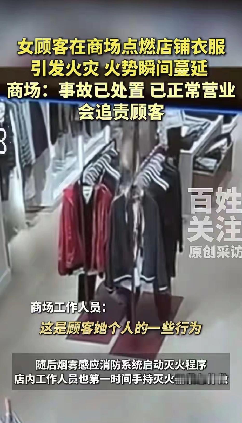 这个女孩不是傻就是蠢,跑进商场里面去故意点火,被监控拍了下来,好在店铺工作人员临危不乱,第一时间拿起灭火器进行扑救。多方努力下,火情得以控制,未造成更大灾难,目前涉事店铺已恢复正常营业。 故意纵火是要坐牢的,大好的青春就这样被自己的一时冲动给毁了。也不知道她会不会后悔。