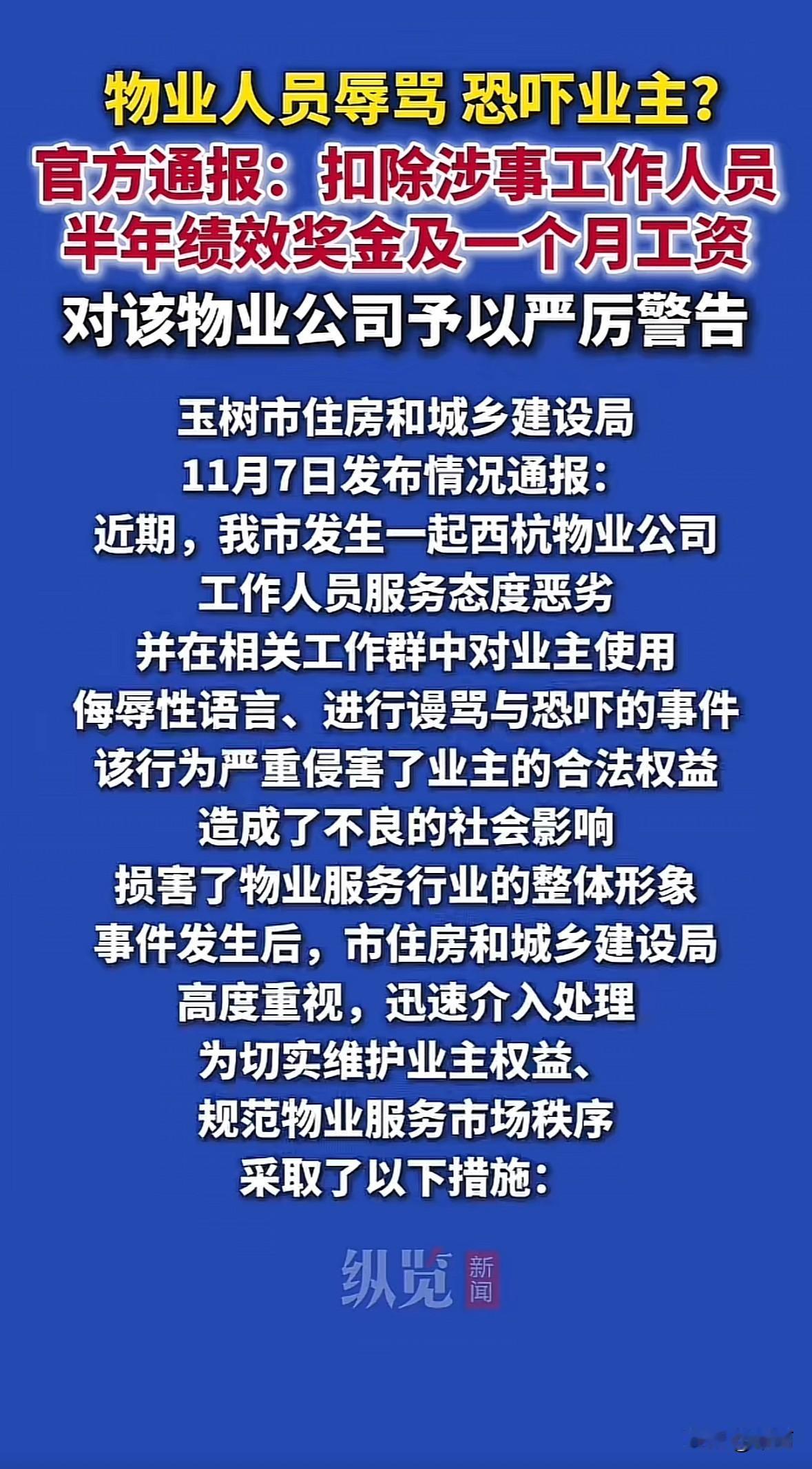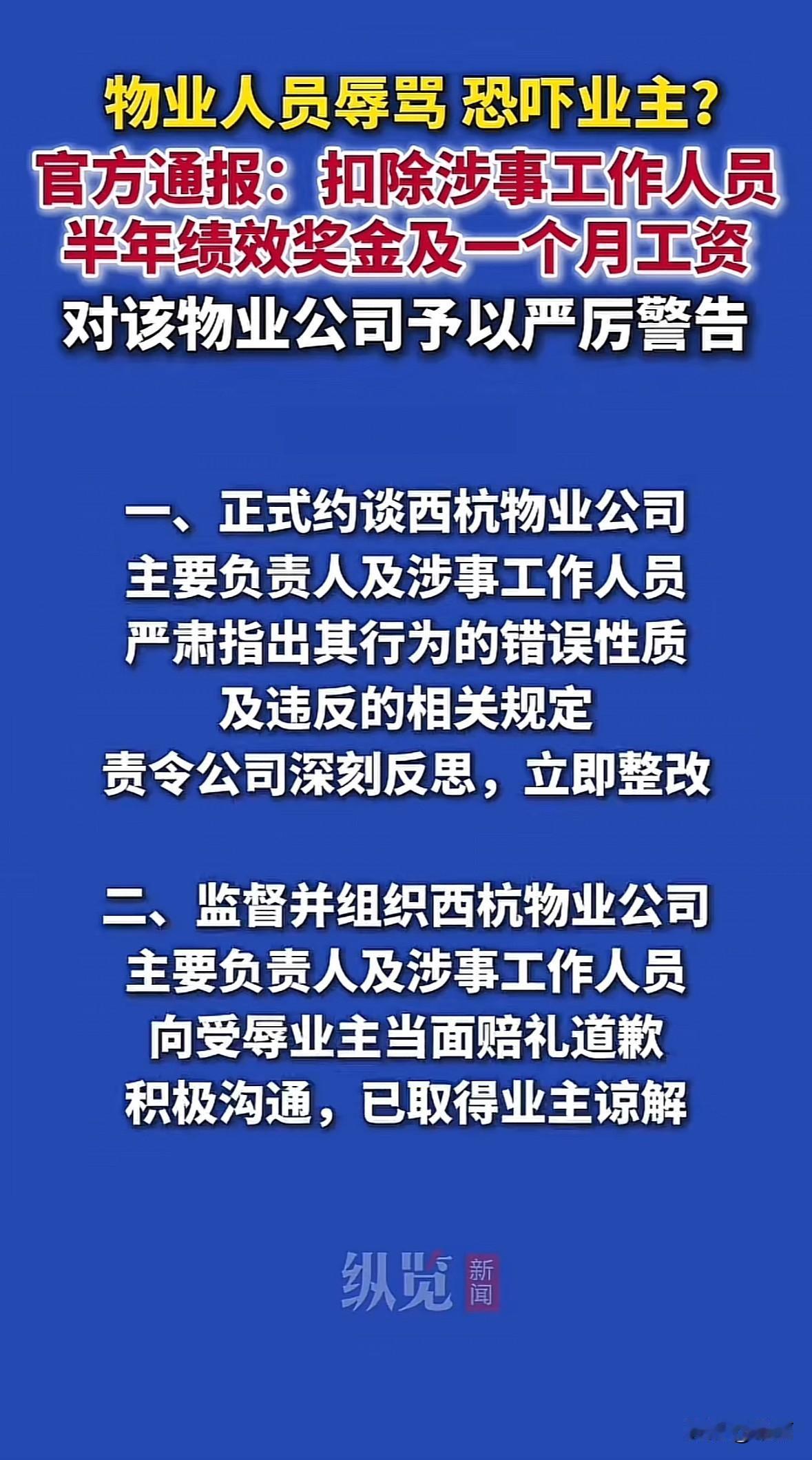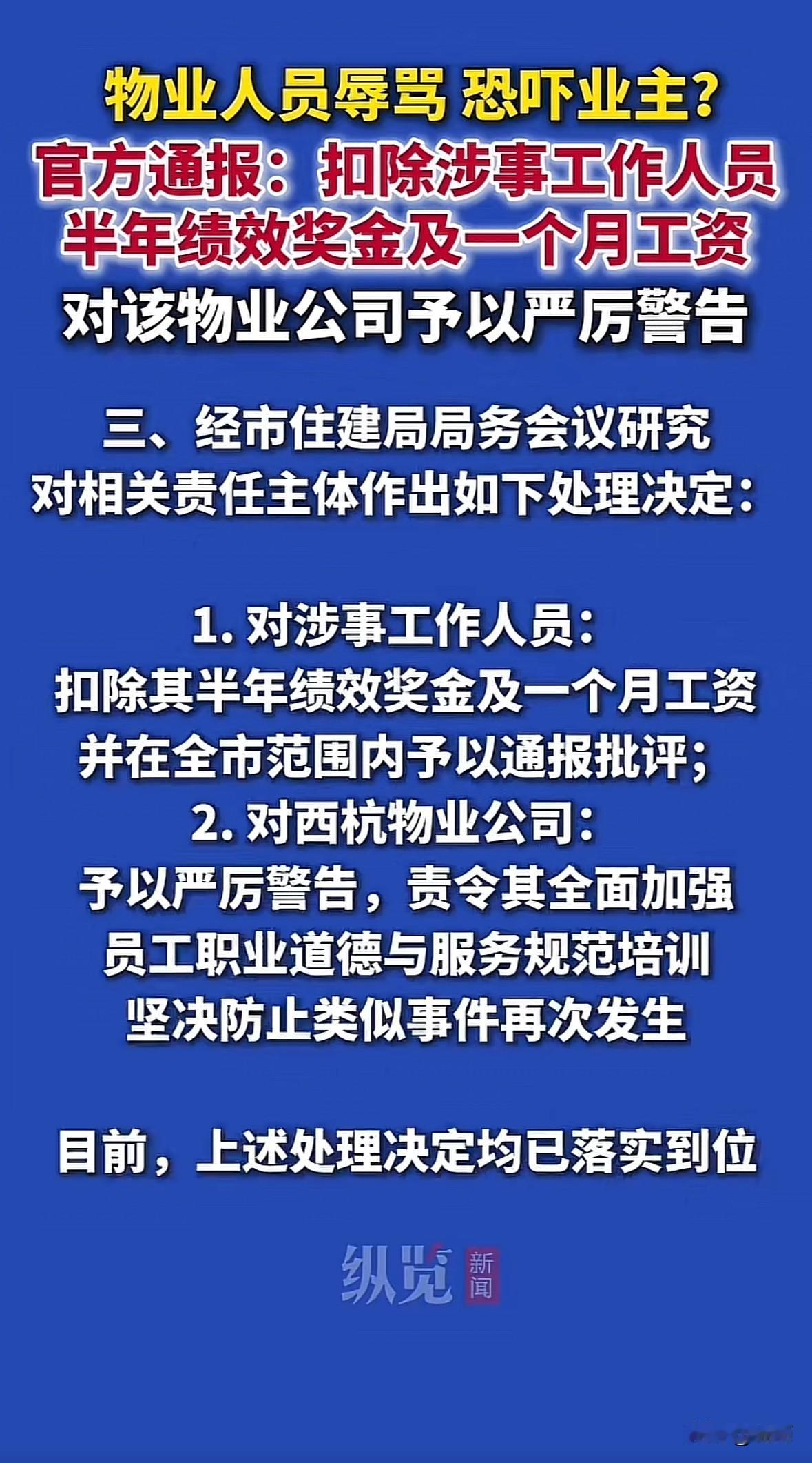 近期青海玉树西杭物业公司的工作人员,在小区工作群里对业主用侮辱性语言谩骂、恐吓,这事让不少人反感。11月7日当地住建局发了通报,涉事人员已经当面给业主道歉获谅解,还被扣除半年绩效和一个月工资、全市通报批评,物业公司也被严厉警告,要求加强员工培训。 物业本来是业主请来的“管家”,拿了物业费就该好好服务,辱骂恐吓业主完全突破了职业底线。还好主管部门处理得快,这也给所有物业公司提了醒:服务行业得守本分,尊重业主是基本要求。希望后续物业公司真能落实培训,监管也别放松,别让“管家”变成“恶管家”,让业主能住得舒心。