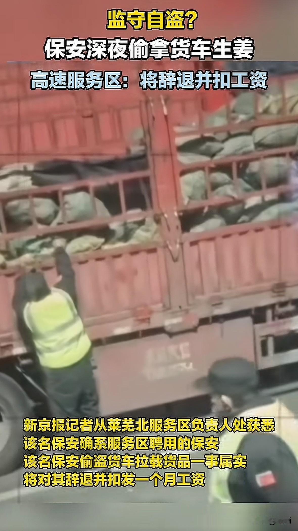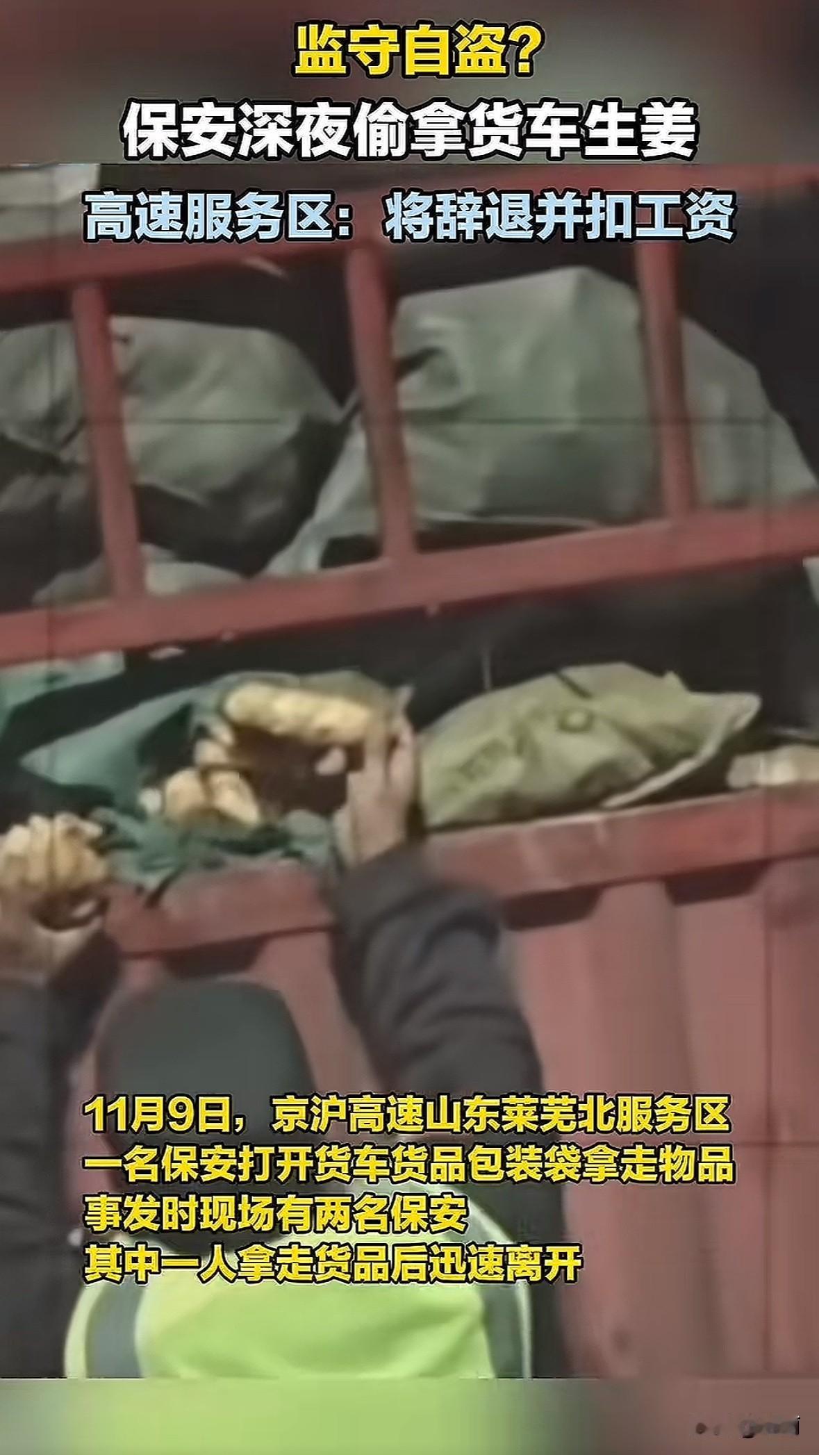 11月9日,京沪高速山东莱芜北服务区发生件挺让人唏嘘的事:深夜里,一名保安趁着货车停靠,偷偷打开货品包装袋拿走了生姜,现场还有另一名保安在场。这事后来被核实属实,服务区已经把涉事保安辞退,还扣了他一个月工资。 保安本是守护财物安全的,结果监守自盗,实在说不过去。货车司机跑长途挣的都是辛苦钱,拉的货物更是生计所系,这么偷偷拿别人东西,既坏了职业操守,也寒了人的心。好在服务区处理得还算及时,没姑息这种行为。 其实不管啥岗位,守规矩、有底线都是最基本的。拿着这份工资,就得尽到这份责任,可不能因小失大,丢了职业道德不说,还毁了自己的口碑和工作。大家觉得这种处理力度够不够?
