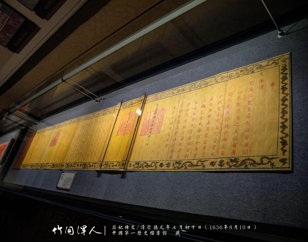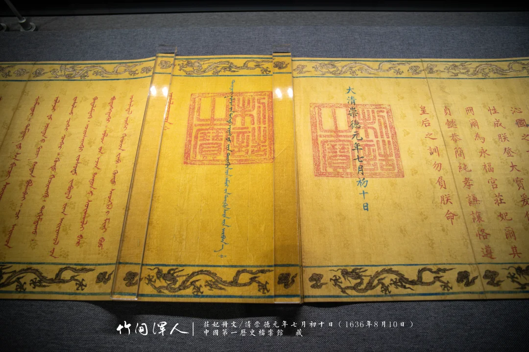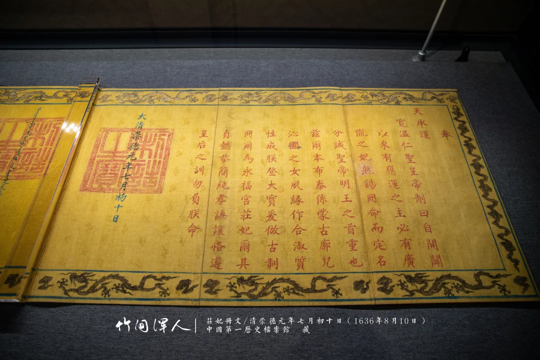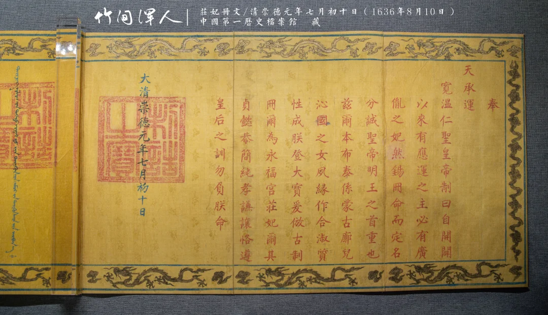 崇德元年,皇太极称帝,册立一后四妃(目前5份册文仅存庄妃的这一份),其中蒙古科尔沁部博尔济吉特氏本布泰被封为永福宫庄妃(满语为jingji fujin,直译“庄重福晋”),《庄妃册文》用满、蒙古、汉三种文字书写,内容是:“奉天承运,宽温仁圣皇帝制曰,自开辟以来,有应运之主,必有广胤之妃。然锡册命而定名分,诚圣帝明王之首重也。兹尔本布泰系蒙古廓儿沁国之女,夙缘作合,淑质性成。朕登大宝,爰仿古制,册尔为永福宫庄妃。尔其贞懿恭简纯孝谦让,恪遵皇后之训,勿负朕命”,后钤有阳文朱印“制诰之宝”。《庄妃册文》是清朝首次册封后妃的珍贵资料,于2010年如入选《中国档案文献遗产名录》。