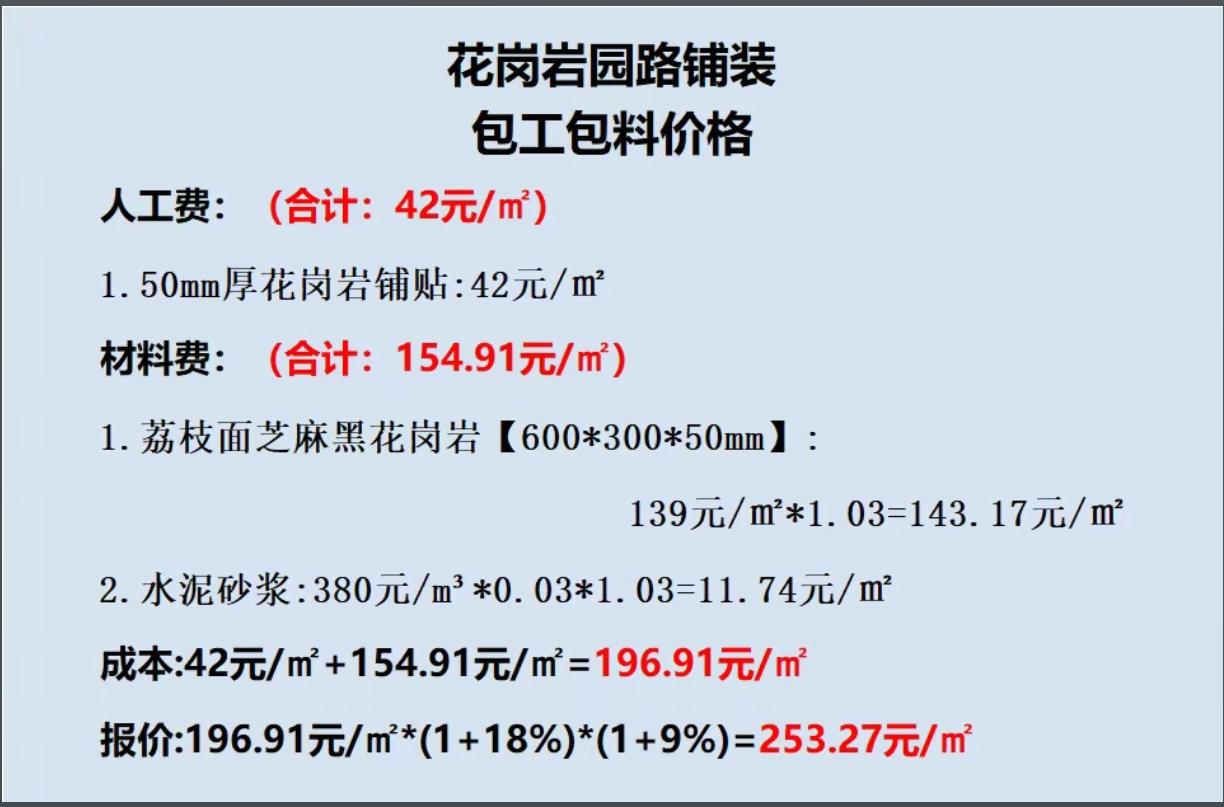 家人们,花岗岩园路铺装想不踩坑,这些细节得盯紧了! 先看人工,每平米42元全花在50mm厚花岗岩铺贴的手艺上。避坑关键是看师傅的铺装手法,缝隙要均匀一致,铺贴得平整牢固,别出现空鼓——后期踩坏了返工,人工钱就得加倍,还影响整体美观。 材料这块每平米154.91元,大头是荔枝面芝麻黑花岗岩,得认准60030050mm的规格,算上损耗每平米143.17元,收货时一定要量厚度,别用40mm的充数,偷工减料会影响承重。水泥砂浆每平米11.74元,配比得达标,不然黏结不牢,石板容易松动。 总成本快200元每平米,报价253元左右含了合理利润和税费。签合同必须写清花岗岩的规格、厚度和材质,注明水泥砂浆配比标准,避免后期用劣质材料以次充好。 记住,铺装时现场盯着材料规格和铺贴工艺,这钱花得才值当,园路既耐用又好看!你们铺装时遇过哪些猫腻?评论区聊聊~