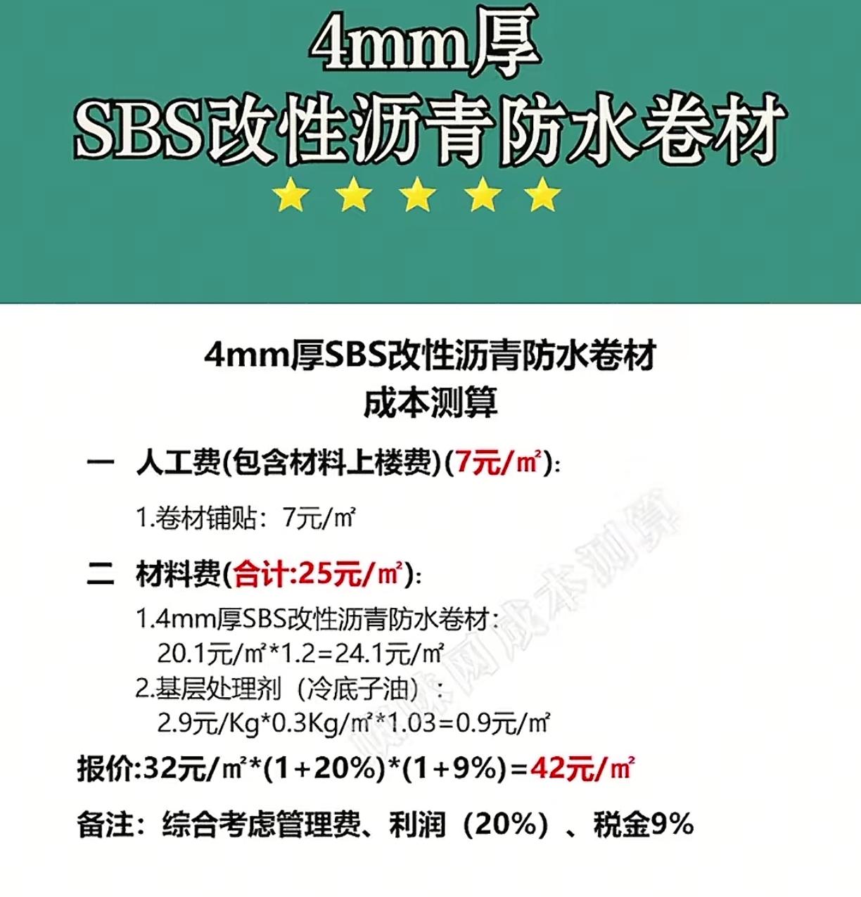 家人们,今天来给大家扒一扒4mm厚SBS改性沥青防水卷材的成本账,搞工程的朋友可得留意了! 先看人工费,每平米7块钱,这里面已经包含了材料上楼的费用,主要就是卷材铺贴的人工成本。 再看材料费,总共是每平米25块。具体来说,4mm厚的SBS改性沥青防水卷材,算上1.2的损耗系数,每平米是24.1元;还有基层处理剂,也就是冷底子油,算上损耗后每平米0.9元,这两项加起来就是材料的总花费。 那总成本就是人工加材料,7元加25元,每平米32元。在此基础上,加上20%的管理费和利润,再加上9%的税金,最终报价差不多就是每平米42元。 这么一算,大家对这种防水卷材的成本构成是不是一目了然了?想了解更多工程成本细节的,评论区不见不散~