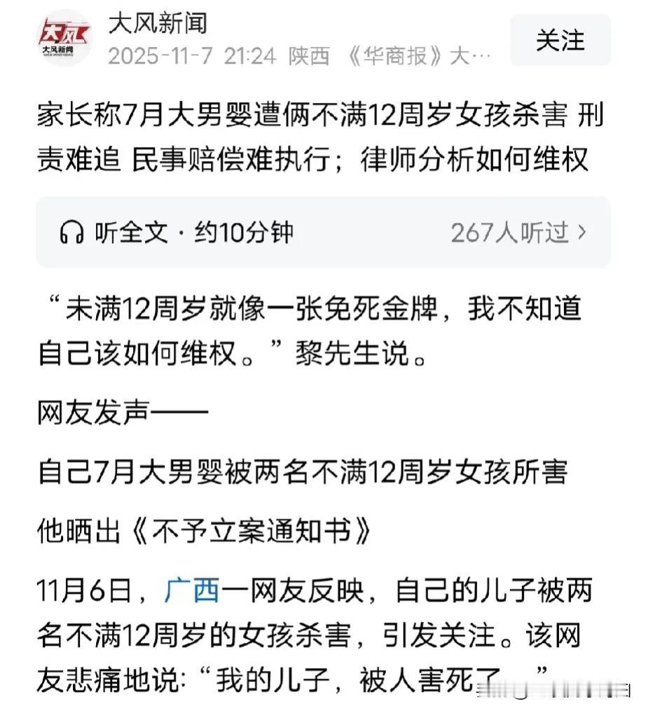 广西百色,7个月大男婴在家中熟睡,邻居两个女孩,趁男婴母亲不注意,悄悄抱去玩了,不知道她们对孩子做了什么,导致孩子面色发紫、呼吸困难。等男婴母亲发现后,将孩子送医,最终,孩子不幸身亡。男婴妈妈悲痛欲绝,悔恨交加得了重度抑郁。 可两女孩因未满12岁,当地公安机关未予立案。男婴家属提起民事诉讼,法院判赔女孩家属赔偿男婴家属90万,没想到,他们各自赔了5万后,没了下文,男婴家属无奈又心酸,不知道该怎么维权了! 是谁也没想到平时经常来家里玩的小姐姐,会成了害死自己孩子的凶手,一个才9岁,一个11岁!也许她们也不知道自己的行为会对一个婴儿造成这么大的伤害,当时男婴的妈妈在干什么呢?为什么放心这么小的2个孩子跟自己的儿子独处? 事情发生在2024年7月21日,黎先生出门工作,妻子梁某在家照顾7个月大的儿子,当时儿子在睡觉,妻子就去忙家务了!这时邻居家2个女孩来家里玩,看小弟弟在睡觉,她们就把他弄醒了,婴儿就开始哭闹,忙家务的妈妈听到后,出来查看。但她也没多想以为是儿子自己醒了,看到经常来家里玩的女孩还挺高兴。 她把儿子哄好后就放在那里,觉得有两个小姐姐跟儿子玩也不错,因为两个女孩也经常来家里跟孩子玩,应该是挺喜欢儿子的,她交代两个女孩几句就又去忙家务了! 可她万万没想到,就是自己太相信这两个小女孩了,才导致了儿子的悲剧! 两个女孩不知道是出于什么心理,把婴儿抱起来走到别处去玩。等她们把孩子抱给梁某的时候,梁某看到儿子已经面色发紫,呼吸困难了! 她当即吓得不轻,急急忙忙给小黎做人工呼吸、做心肺复苏,可孩子还是没好转,她急得直哭,赶紧给丈夫打电话。 之后,两人把孩子送医抢救,但孩子还是没了,后来经过法医鉴定,小黎“符合胸部受钝性外力作用死亡” 梁某看到儿子的尸体实在不敢相信刚才还在哭啼的儿子,怎么转眼就没了,更无法相信,两个那么小的女孩,怎么就能对儿子下毒手了! 她悔恨,恨自己没有陪在儿子的身边,都是自己的疏忽大意,才导致儿子没命了,失去儿子的痛,后悔自责折磨日日夜夜着梁某,最终她也得了重度抑郁! 黎先生也无法接受突来的变故,他查看了监控,才知道事情的来龙去脉。他无法原谅伤害儿子的人,于是就报警! 可两个女孩一个才9岁,一个才11岁,都未到12周岁不予立案!无奈黎先生又提起民事诉讼,让女孩的家属赔偿! 法院经审理判定,黎某和岑某监护人各自承担50%的责任,合计需向小黎父母赔偿905977元。 而两个女孩的父母觉得这不算是女儿的责任,她们还小不懂得分寸,是梁某没看好孩子,她要是在旁边看着哪里会有这样的事,所以一家各给了5万块钱,就不愿意再拿钱了! 现在时间过了这么久了,黎先生仍然没有拿到剩下的80万,他也不知道该怎么维权了,难道年龄就是免死金牌吗?他现在只想给儿子讨一个公道! 看到这里十分同情梁某的遭遇,但不少网友还是觉得最大的问题在于梁某自己,她是怎么放心把那小的儿子交到两个那么小的女孩手上的,不管两个女孩是有意的还是无意的,妈妈的失责也是悲剧的原因之一! 但不管怎样人家失去儿子是真的,不管两个女孩是否故意,伤害都造成了,该赔偿就得赔偿,法院判了就有一定的道理,你不满可以再上诉,但不能拖着不给! 别像网友说,最后把梁某刺激了,对你们的孩子做出什么事来,她可是有抑 郁症的! 带孩子无小事,一定要时刻注意,不管是谁,孩子都不能离开自己的视线,因为你也不知道身边的是天使还是恶 魔! 对此你怎么看? (信息来源:大风新闻,侵删[祈祷])