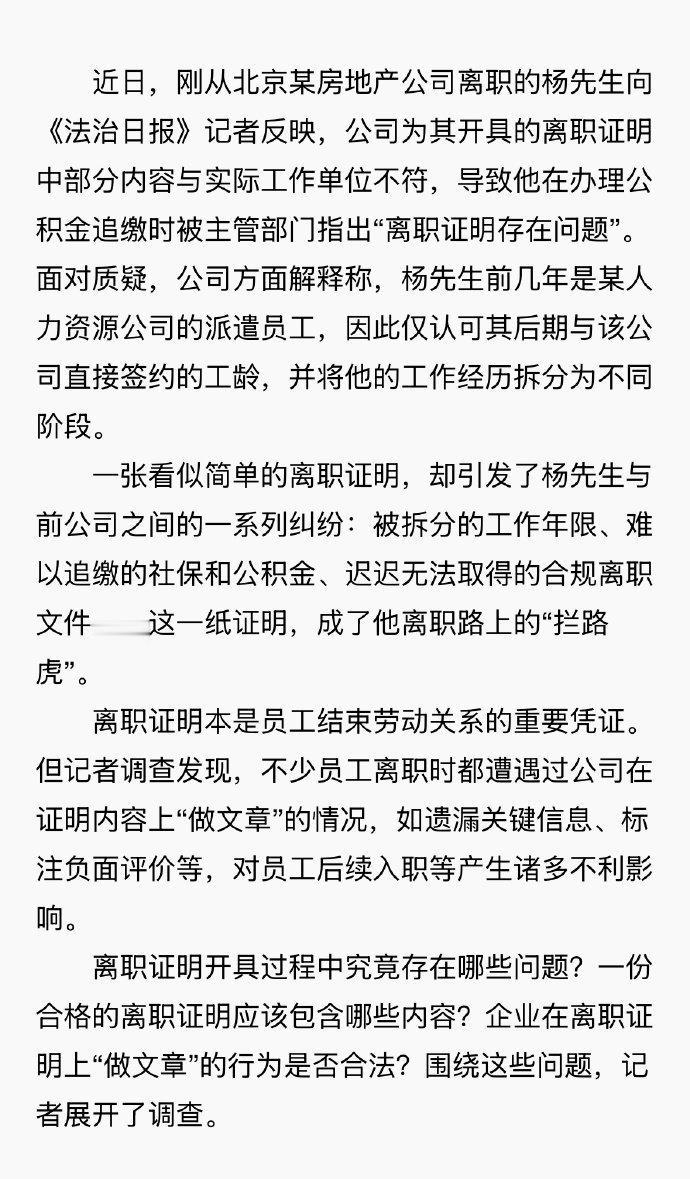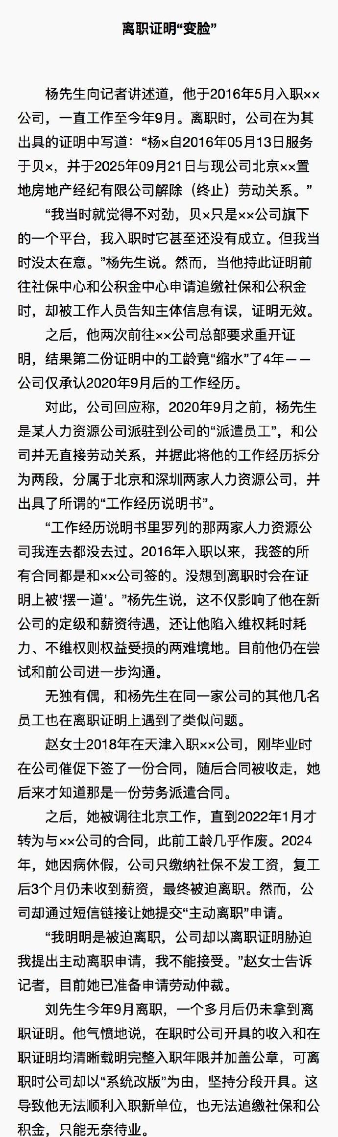 【任职9年公司却只承认5年工作经历开具离职证明受阻乱象调查】一张看似简单的离职证明,却引发了杨先生与前公司之间的一系列纠纷:被拆分的工作年限、难以追缴的社保和公积金、迟迟无法取得的合规离职文件……这一纸证明,成了他离职路上的“拦路虎”。   杨先生向记者讲述道,他于2016年5月入职××公司,一直工作至今年9月。离职时,公司在为其出具的证明中写道:“杨×自2016年05月13日服务于贝×,并于2025年09月21日与现公司北京××置地房地产经纪有限公司解除(终止)劳动关系。”   “我当时就觉得不对劲,贝×只是××公司旗下的一个平台,我入职时它甚至还没有成立。但我当时没太在意。”杨先生说。然而,当他持此证明前往社保中心和公积金中心申请追缴社保和公积金时,却被工作人员告知主体信息有误,证明无效。   之后,他两次前往××公司总部要求重开证明,结果第二份证明中的工龄竟“缩水”了4年——公司仅承认2020年9月后的工作经历。   对此,公司回应称,2020年9月之前,杨先生是某人力资源公司派驻到公司的“派遣员工”,和公司并无直接劳动关系,并据此将他的工作经历拆分为两段,分属于北京和深圳两家人力资源公司,并出具了所谓的“工作经历说明书”。   “工作经历说明书里罗列的那两家人力资源公司我连去都没去过。2016年入职以来,我签的所有合同都是和××公司签的。没想到离职时会在证明上被‘摆一道’。”杨先生说,这不仅影响了他在新公司的定级和薪资待遇,还让他陷入维权耗时耗力、不维权则权益受损的两难境地。目前他仍在尝试和前公司进一步沟通。(全媒体记者 孙天骄)