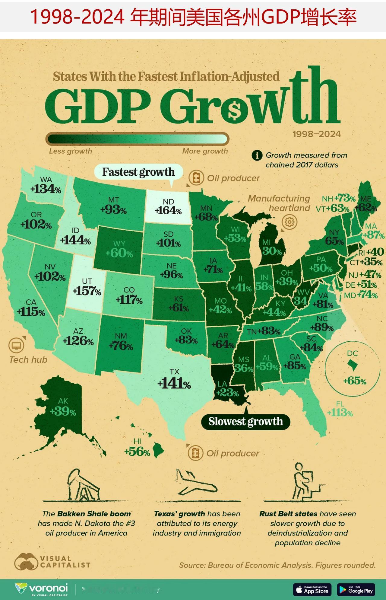 在1998-2024 年期间,美国哪些州的实际国内生产总值增长快? 20 世纪 90 年代是另一个时代。那时美国还没有宽带网络,汽油价格为一美元,而且许多州仍依赖制造业作为经济支柱。 即便如此,新的科技集群以及更先进的钻探技术也开始改变着美国地理格局,从而为如今能源丰富且以科技产业为主导的各州奠定了坚实的基础,使其成为了经济实力最强的地区。 该可视化图表根据 1998 年至 2024 年期间经通胀调整后的国内生产总值增长率,对全美 50 个州以及哥伦比亚特区进行了排名。美国各州实际国内生产总值的增长数据来自经济分析局。 ——美国的页岩能源繁荣一览 由于巴肯页岩区的开采热潮,北达科他州的经济规模增长了近两倍,其实际产出增长了 164%——这一增幅是美国平均水平的两倍。 得克萨斯州已经是美国最大的石油生产州,其产量增长幅度更是高达 141%。 新墨西哥州和俄克拉荷马州也跻身前 20 名之列。低廉的原材料成本、液化天然气(LNG)出口量的不断增加以及相关的中游产业建设,帮助这些州获得了美国能源产量大幅增长所带来的大部分收益。 ——科技与旅游中心持续实现快速扩张 犹他州(增长了 157%)、爱达荷州(增长了 144%)以及华盛顿州(增长了 134%)的情况表明,多元化的科技行业能够极大地推动各州的国内生产总值增长。 微软的云服务业务、爱达荷州的半导体工厂以及犹他州的“硅坡”地区共同促进了高薪就业岗位的增加,并吸引了外来人口的迁入。 即便是加州(增长了 115%)和佛罗里达州(增长了 113%)这样的大型经济体,其经济增长率也超过了美国各州的平均增长率。这表明科技和专业服务集群能够带动更广泛的经济活动。 ——“铁锈地带”和沿海落后地区 中西部和阿巴拉契亚地区的制造业为主地区表现普遍不佳。密歇根州(增长了 30%)和西弗吉尼亚州(增长了 34%)在经历了 21 世纪初的经济衰退和“大金融危机”之后,其工业产出的损失一直未能完全弥补。 康涅狄格州(增长率为 35%)和新泽西州(增长率为 47%)的例子表明,高昂的物价以及缓慢的人口增长对东海岸地区的经济造成了沉重的负担。 路易斯安那州遭受了多场飓风袭击,并且多家炼油厂也停产了,该州的经济增长率仅为 23%,仅为全美平均水平的四分之一。美国发展趋势