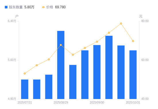 日期A股户数(户)流通A股户均持股数(股)户均持股市值(万元)2025-10-31580009347.3065.232025-10-20590009188.8772.402025-10-10610008887.6065.812025-09-30590869175.5063.712025-09-19580009347.3861.922025-09-10550009857.2361.832025-08-29620008744.3259.262025-08-205300010229.2061.722025-08-085200010425.9259.752025-07-315200010425.9255.37