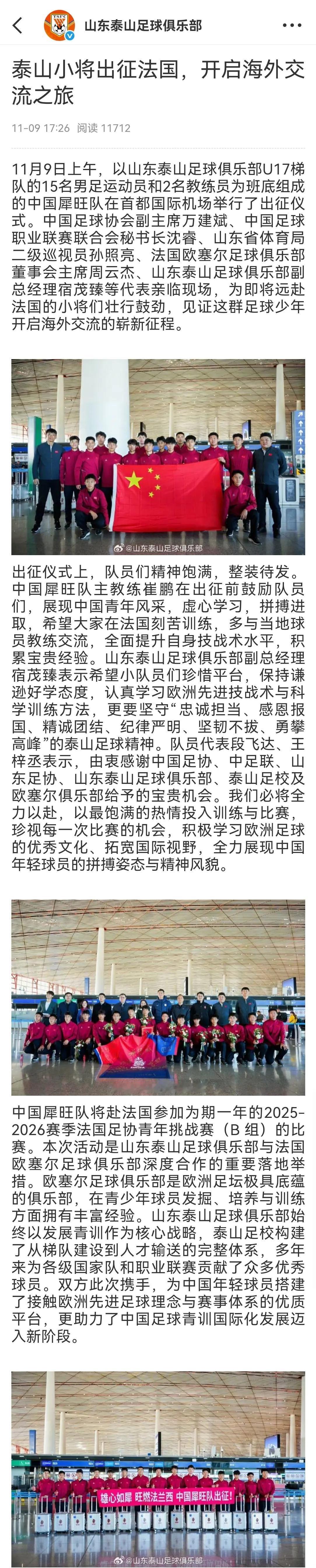 抓青训,足协放大招。今天,以山东泰山u17为班底的中国犀旺队整体赴法甲欧塞尔进行为期1年的训练,并参加法国青年挑战赛B组比赛,接受五大联赛的熏陶。 前不久,中法两国足协和欧赛尔老板深度接洽年轻球员留洋之事,这次选青训最强的泰山u17整队成建制走出去,这模式很好。 两点希望:一是别让中国犀旺队真成犀牛一般的独角兽,而是创造更多形式,为更多的孩子们去法国乃至五大联赛训练比赛拓宽渠道;二是希望犀旺队的娃娃们,可别自成体系自我循环,而是主动融入法国足球,抓紧能力增强、素质提高。