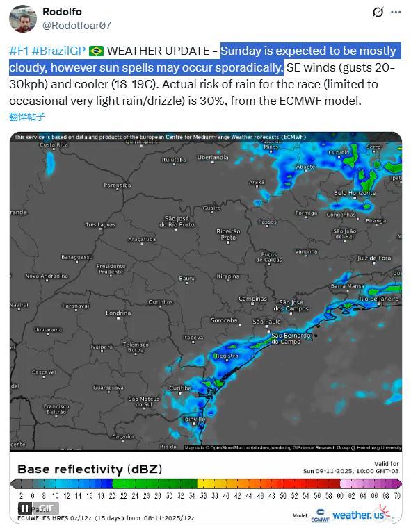 圣保罗今天比赛期间天气将以多云为主,偶尔有阳光,东南风(阵风20-30km/h)、温度低一些(18-19度)、降水概率30%(可能下小雨或毛毛雨)