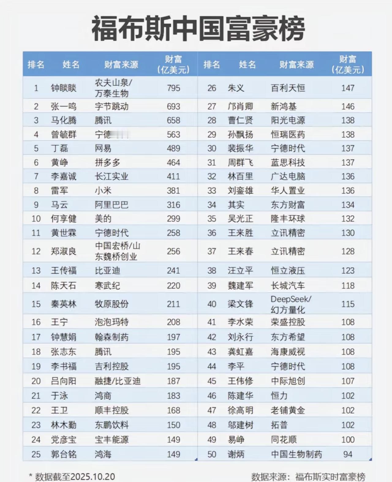 2025福布斯中国内地富豪榜,钟睒睒连续五年蝉联榜首,雷总排名第7[并不简单]