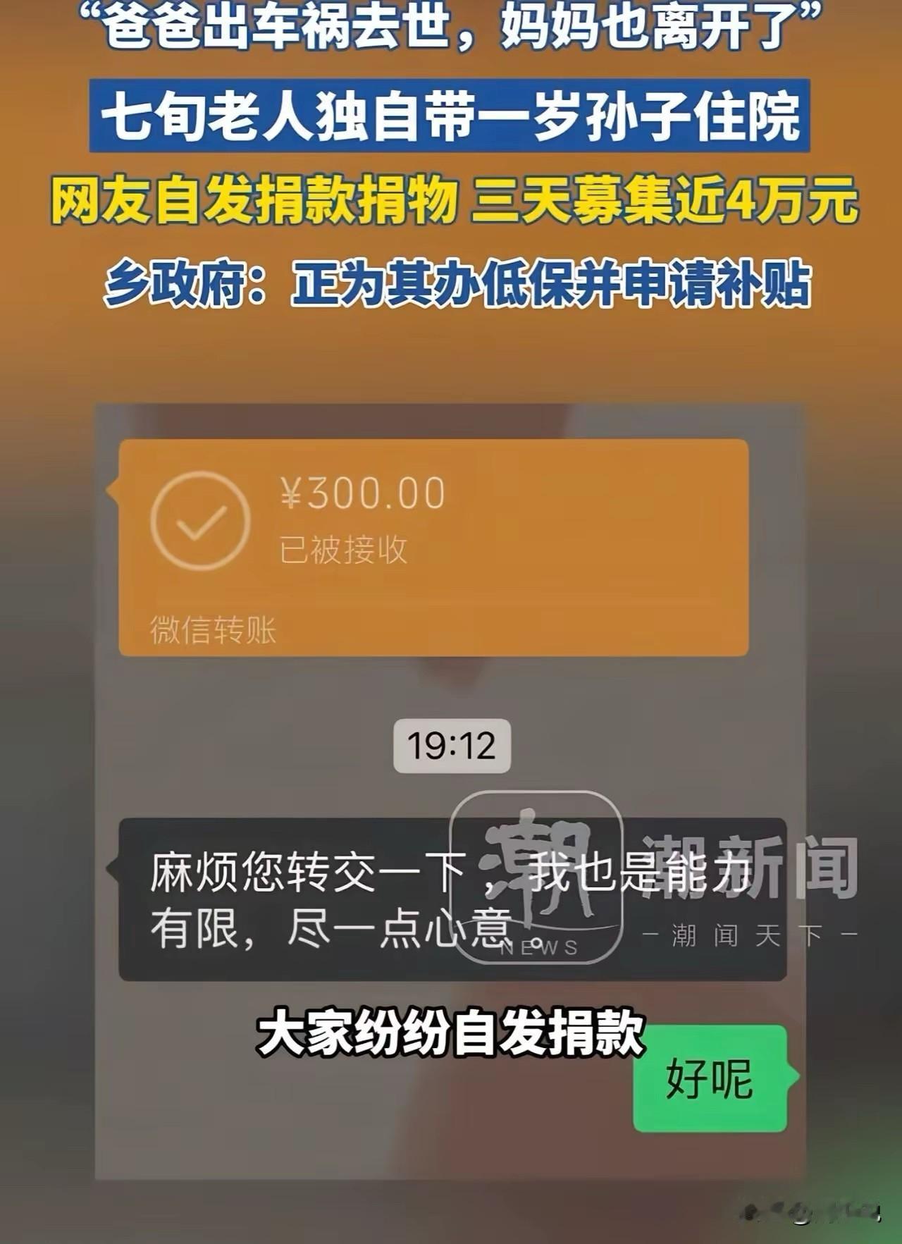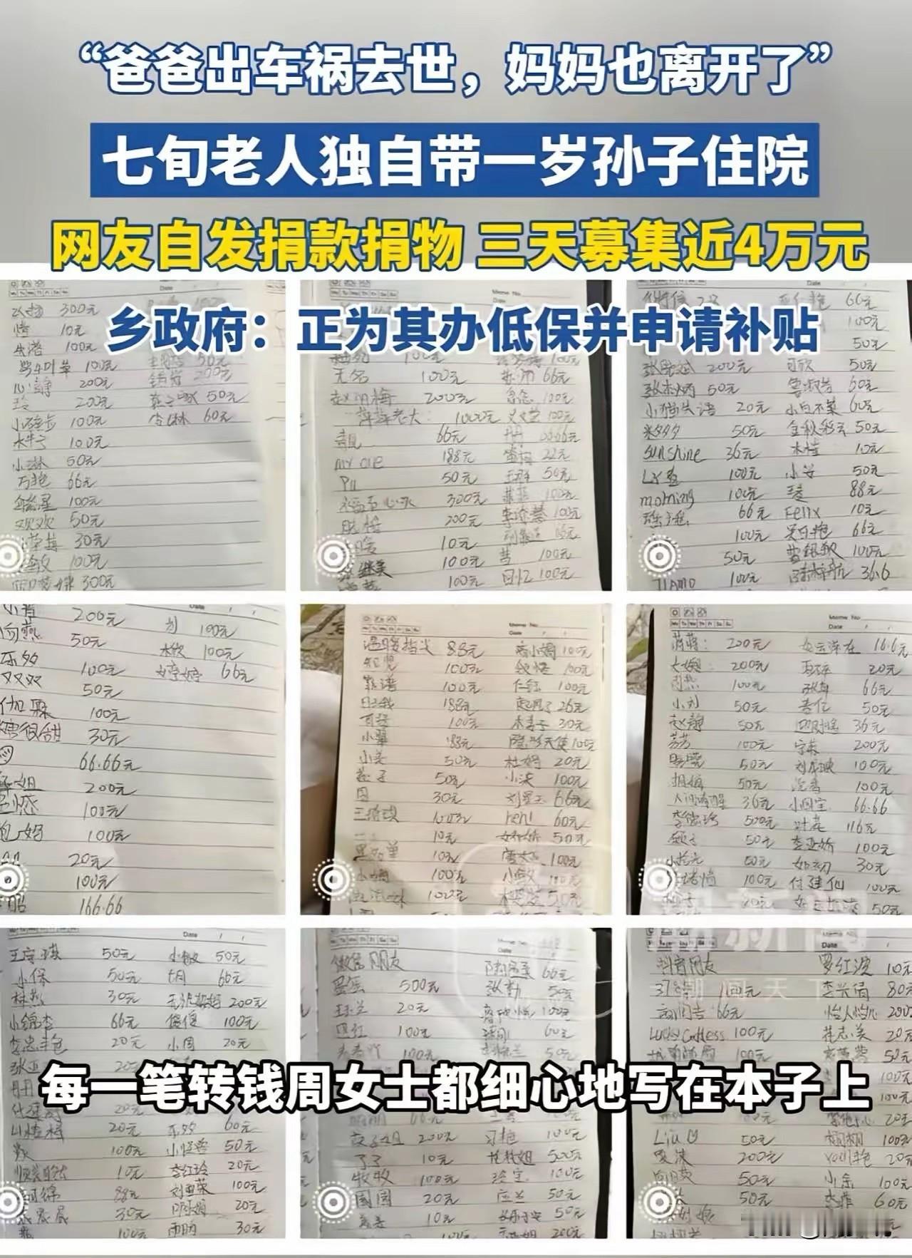“泪目!”云南昆明某病房,周女士发现临床一幕令人心疼:1岁宝宝穿着单薄衣物住院,陪护的竟是位70多岁老人,老人吃饭还格外节俭,生怕多花一分钱。 周女士忍不住询问,老人含泪道出实情:孩子2个月大时,爸爸车祸离世,妈妈丢下祖孙俩失联,如今只剩他俩相依为命。 周女士满心同情,次日便给孩子买了新衣服,还塞给老人几百元,丈夫也贴心为老人买了厚外套。她将此事发到网上,没想到引发数万网友关注,大家自发捐款,短短两天汇聚近3万元。 周女士仔细记录每笔善款,全额转交老人,老人激动得双手颤抖。目前孩子肺炎好转即将出院,当地乡镇政府也在为孩子办理低保和育儿补贴。 此事引发网友热议,有网友说:“善良会传染!周女士的小小善举,给祖孙俩撑起一片天”! 也有网友称:“老人太不容易,还好有这么多好心人帮忙,愿孩子健康长大”! 还有网友则表示:“为认真记账的周女士点赞,让爱心不被辜负”。 周少想说一场意外让祖孙俩陷入绝境,而周女士的善意就像一束光,点燃了众人的爱心。善良从不是孤军奋战,一个人的小小举动,能汇聚成改变困境的力量。 除此之外,让周少更动容的是,当地乡政府的及时介入也让这份温暖延续,愿这份善意能一直传递,为更多困境中的人带去希望。 对于这样的情况,大家有被感动到吗?#寻美三湘# #长沙新朋友#