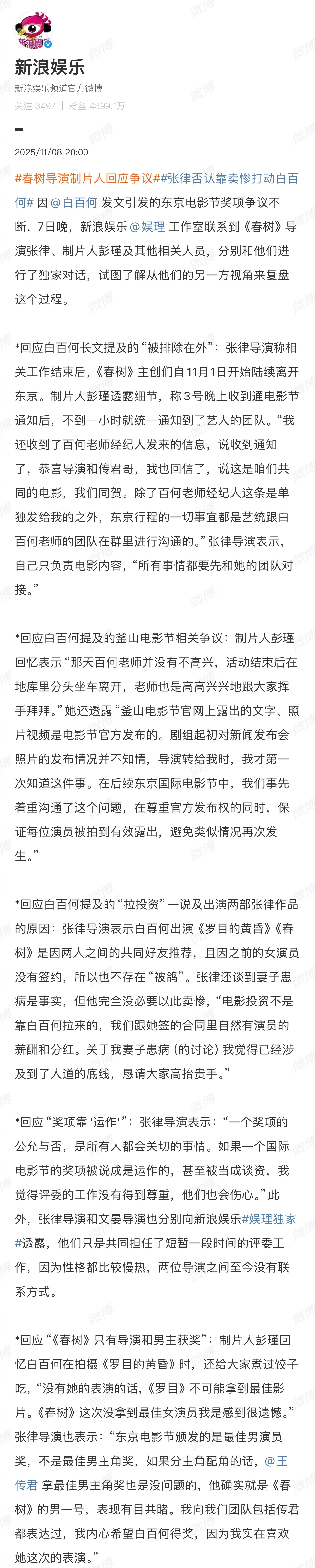 春树导演制片人回应争议 按照这个回应,就是白百何撒了谎,这其中有很多沟通的问题。一个剧组本来应该像一家人,有啥不解和不爽私底下说清楚就好,现在双方在网上几个来回,看着还留有一份体面,私底下估计都在骂街了。最近的影视圈,乌烟瘴气。