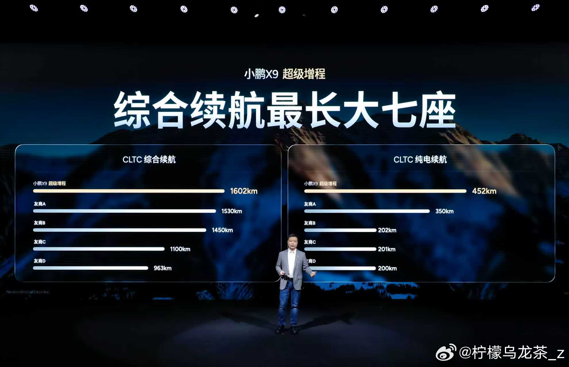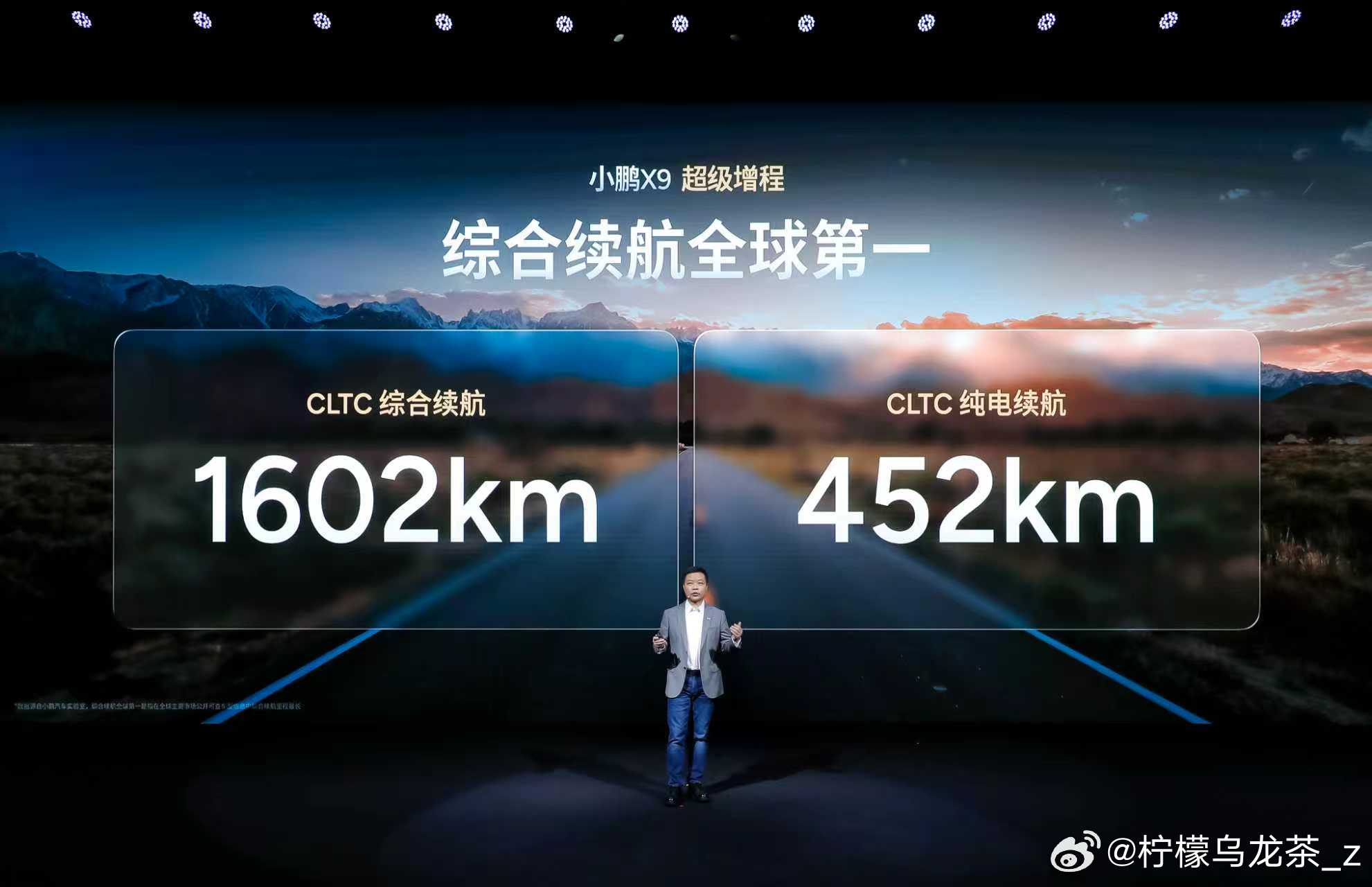 小鹏X9超级增程以1602公里CLTC综合续航,452公里CLTC纯电续航,媲美主流纯电、混动车型,树立全球综合续航最长大七座新标杆: